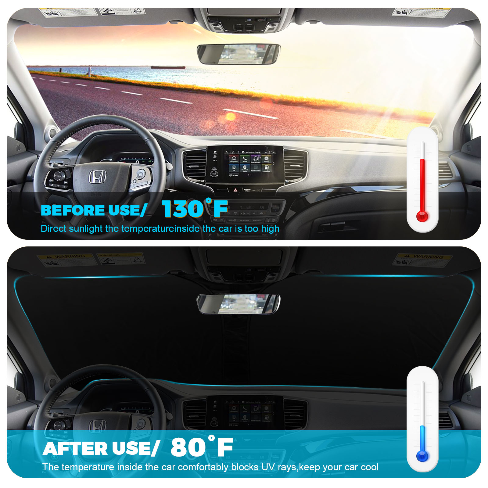 Upgraded Design —— Unlike other products on the market, we use a double layer of heat shield fabric to keep out the sun. The first layer is premium 210T reflective polyester and the second layer is high-quality fabric. Double insulation, and double protection.The best shade and insulation on the market.