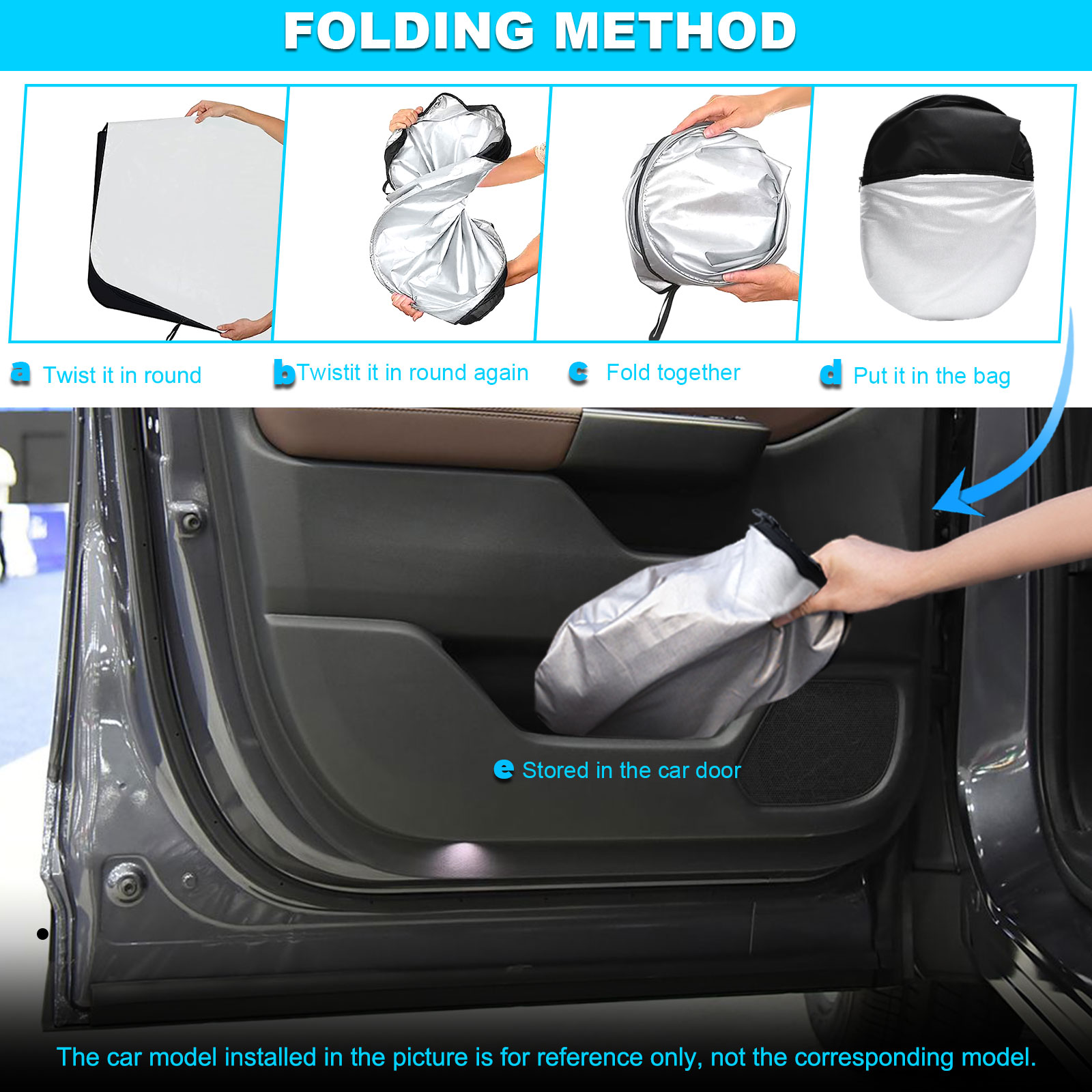 Easy to use and store —— The shade can be easily popped up and folded in seconds for everyday use. You can easily tuck the sunshade into your door pocket.