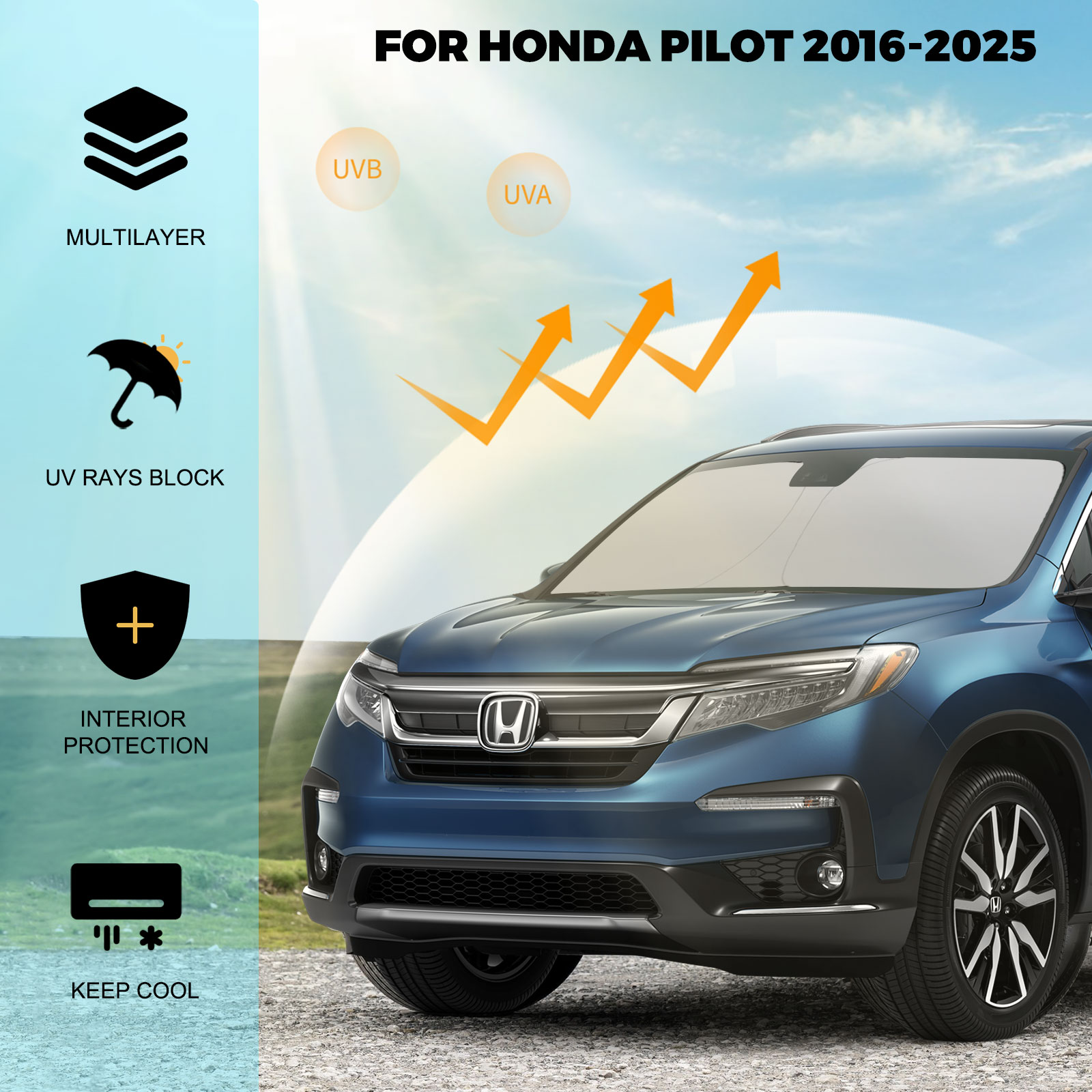 Custom Fit —— Perfectly fit for Honda Pilot 2016 2017 2018 2019 2020 2021 2022 2023 2024 2025.Highly precision model design,fits the edges exactly and just put it in your car windshield window.According to the car size design,100% fit your car and does not need to trim.