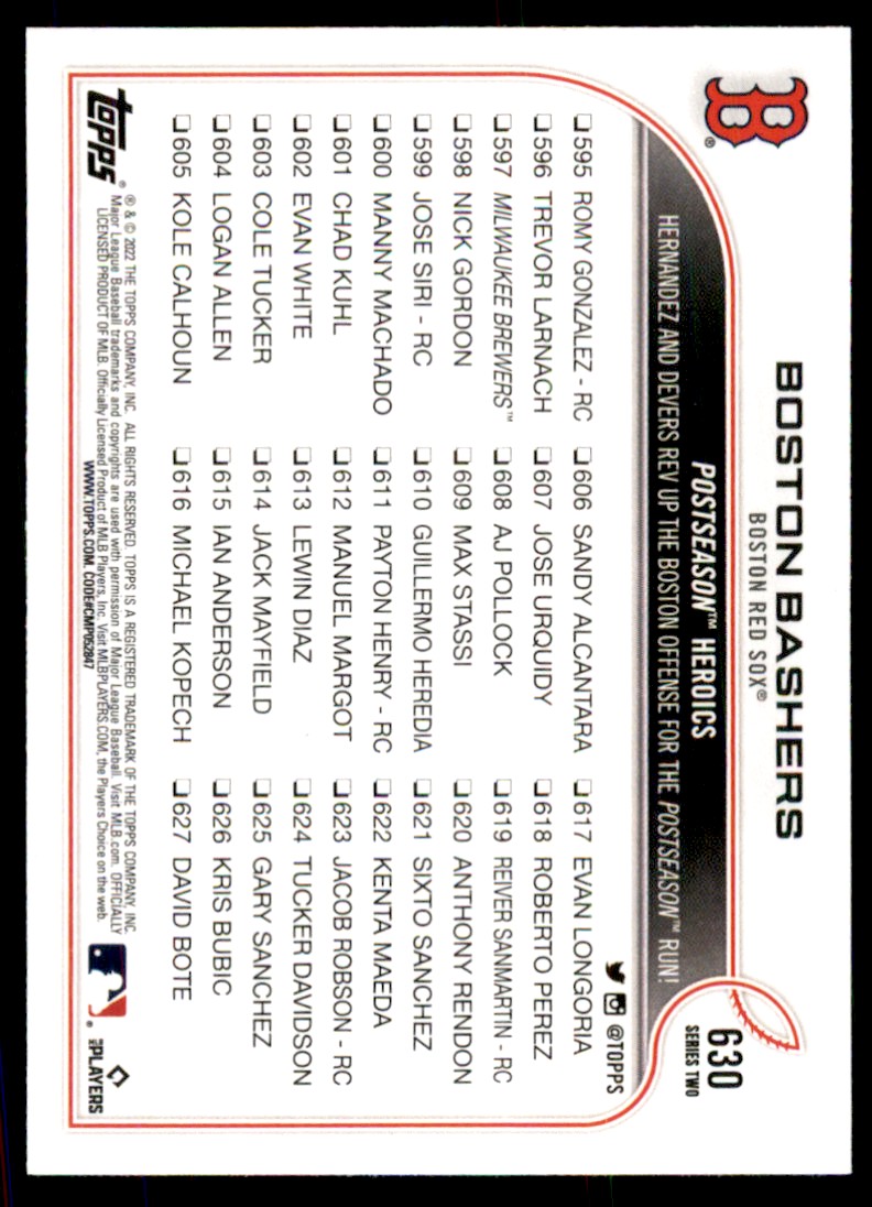 | Description: | Boston Bashers | | Category: | Baseball | | Year: | 2022 | | Product: | Topps | | Team: | Boston Red Sox | | Card Number: | 630 | | Dimensions: | 3½" x 2½" |