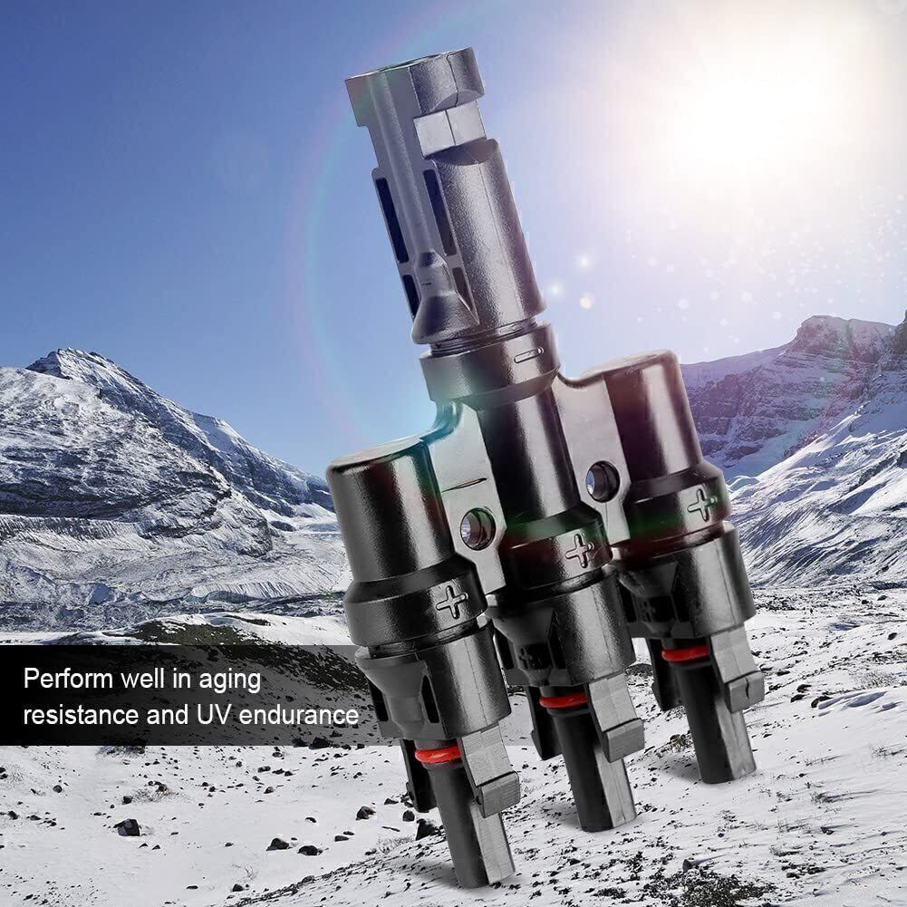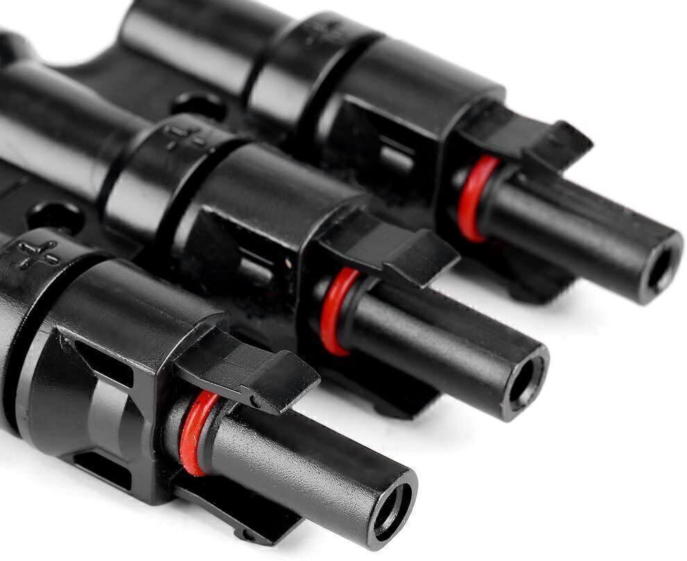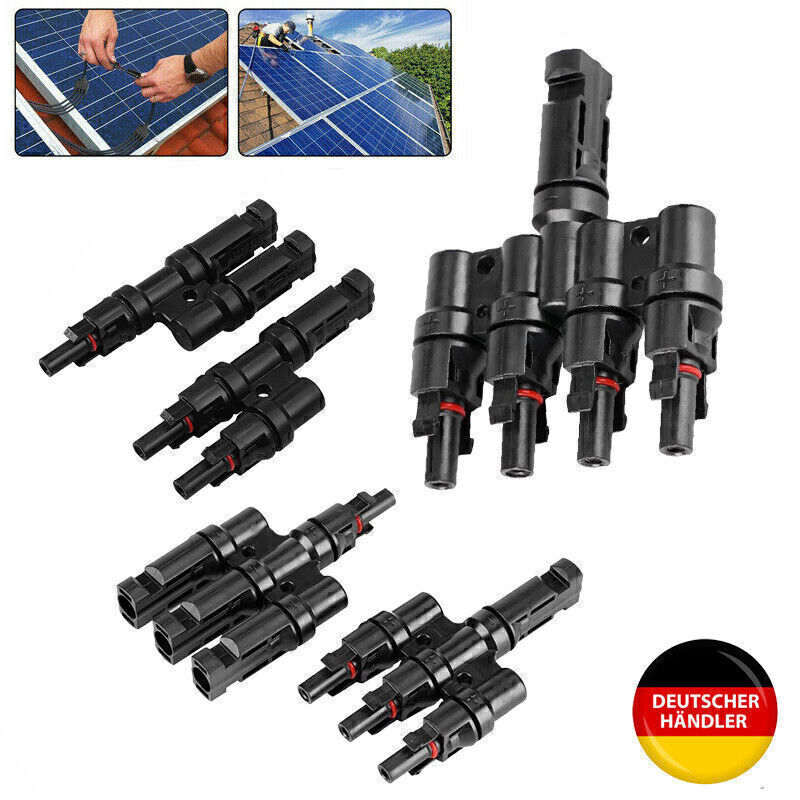 2 Zweig: T Typ Stecker / Buchse Solarpanel-Kabelstecker: eine Frau zu einem Doppelmann (F / M / M) und ein Mann zu einer Doppelfrau (M / F / F) Isoliermaterial: PPO Farbe: Schwarz Kontaktmaterial: Kupfer, versilbert Nennstrom: 50A Retaed-Spannung: 1000 VDC Prüfspannung: 6000 VDC (50 Hz, min) Schutzklasse: II Kontaktwiderstand: 0,5 mΩ Temperaturbereich: -40 ° C bis + 90 ° C. Schutzart: IP67 Flammenklasse: UL94-VO Einführkraft: ≤ 50N Rückzugskraft: ≥ 50N