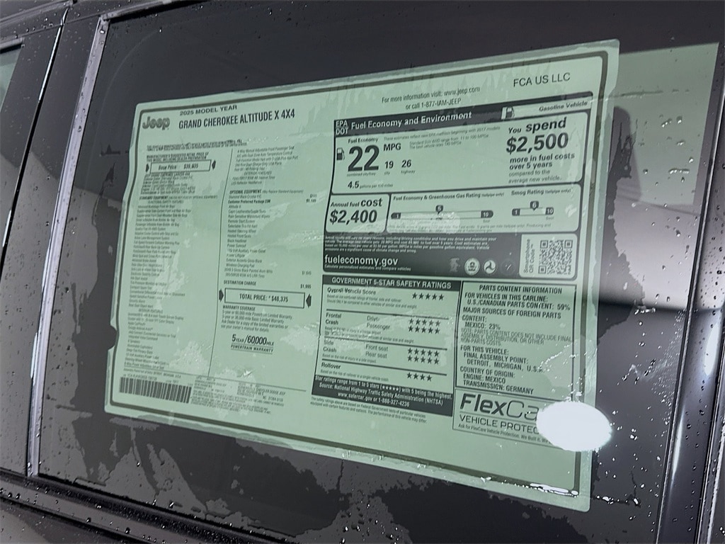 When calling or emailing, please reference stock number 251886.On new vehicles we offer free shipping up to 250 miles and competitive rates on shipping outside that range with our professional in-house shippers! Request a shipping quote. Alternatively, we also offer a $500 credit good towards your preferred shipper or towards one airfare ticket to our dealership so you can pick up your vehicle in person and drive it home! Read more on this below.We stock over 1500 vehicles in inventory and can find the right vehicle at the right price for you! Our in-house shippers offer highly competitive shipping rates to all four corners of the US.MORE ABOUT THIS 2025 Jeep Grand Cherokee Altitude X SUVLEATHER HEATED SEATS! SUNROOF! REMOTE START! BACKUP CAMERA!