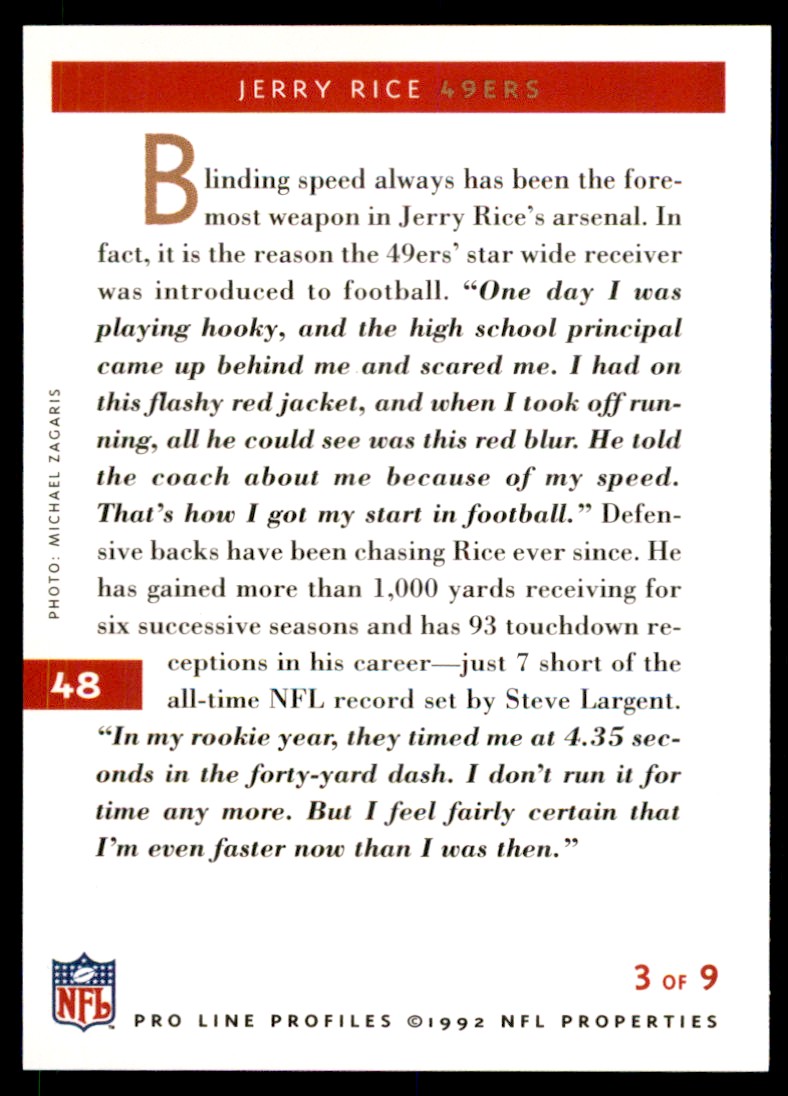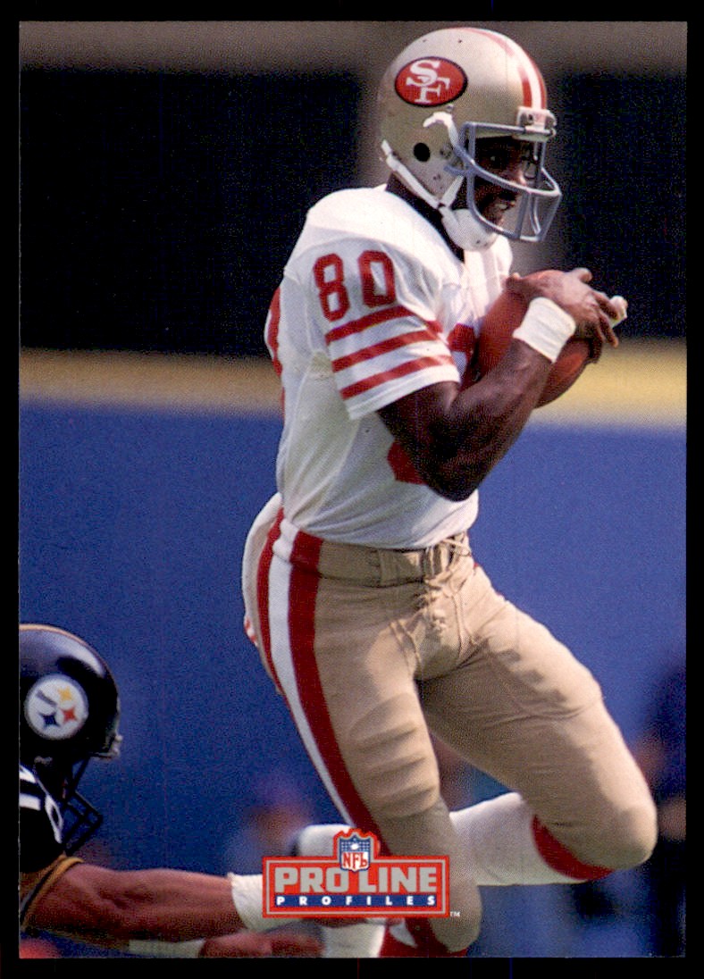 | Description: | Jerry Rice | | Category: | Football | | Year: | 1992 | | Product: | Pro Line | | Team: | San Francisco 49ers | | Card Number: | 8 | | Dimensions: | 3½" x 2½" |