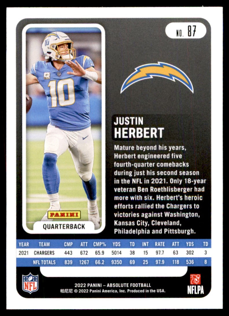 | 2022 Panini Absolute: 87 Justin Herbert |