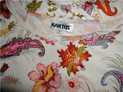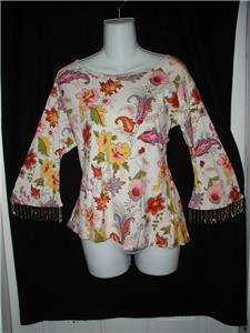 310 Check out this nice ladies size Large shirt made by Kaktus. Multi color floral knit with beaded embellishment on body and fringe trim bottom bell sleeves. Gently used condition.