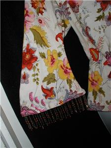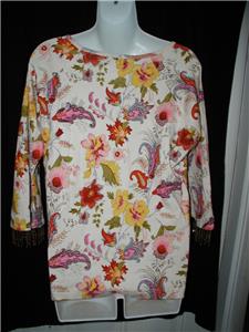 Check out this nice ladies size L shirt made by Kaktus. Multi color floral knit with beaded embellishment on body and fringe trim bottom sleeves. Gently used condition.