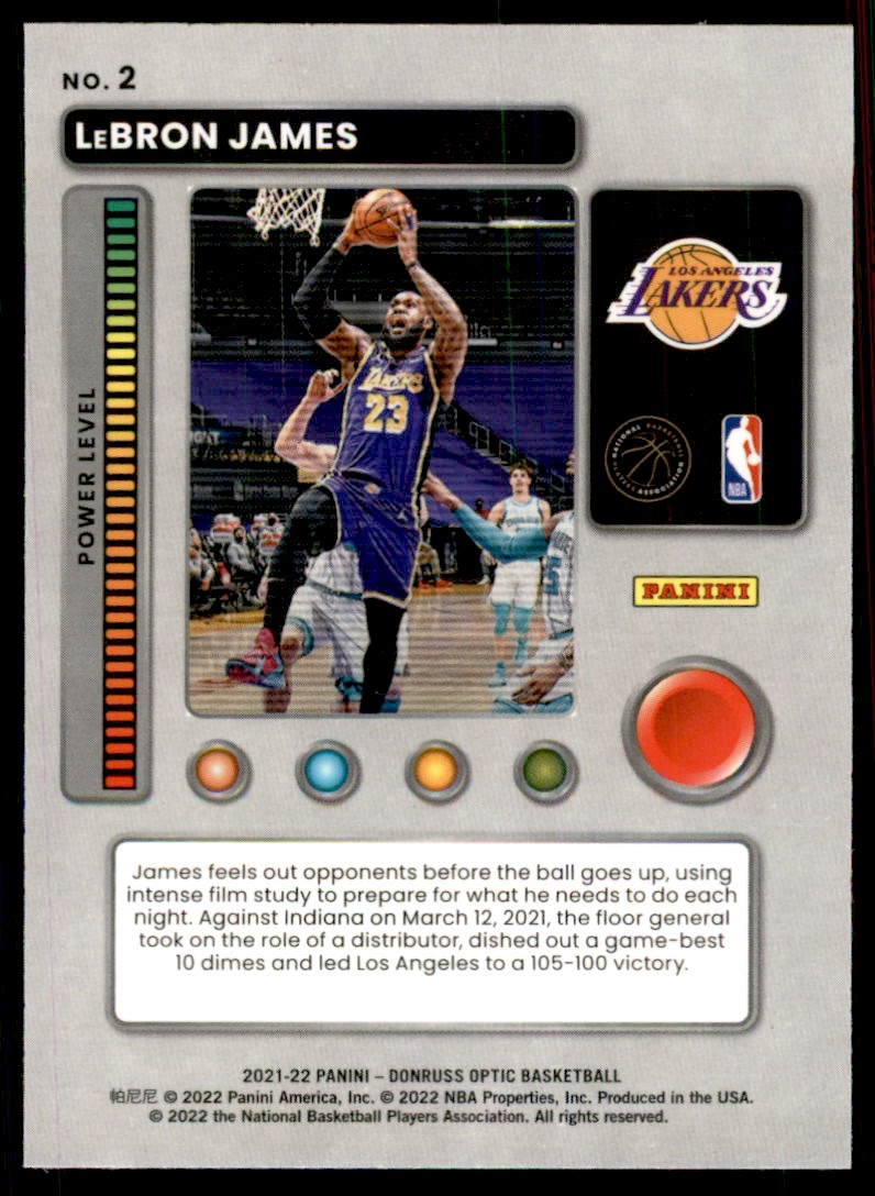 | Description: | LeBron James | | Category: | Basketball | | Year: | 2021 | | Product: | Donruss Optic | | Team: | Basketball Cards | | Card Number: | 2 | | Dimensions: | 3½" x 2½" |