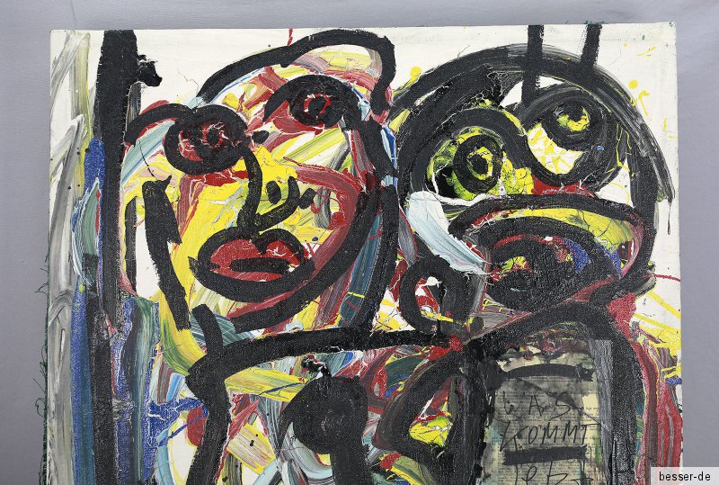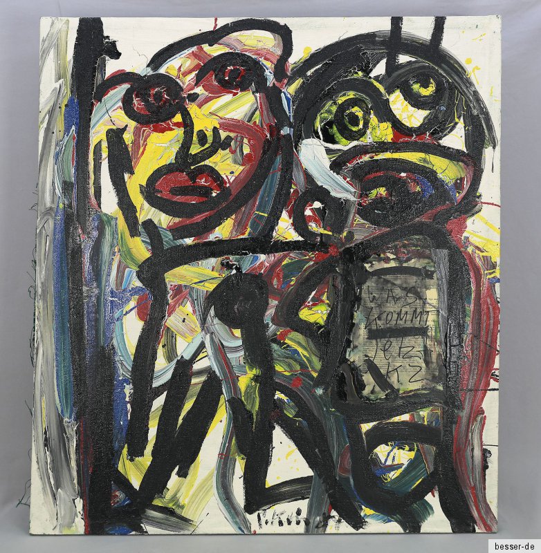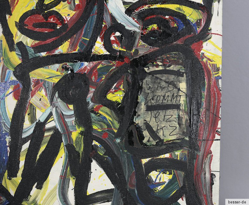 Lieferumfang: Peter Robert Keil (1942 Züllichau, Brandenburg - tätig in Zimmerau, Berlin und Los Angeles), "Was kommt jetzt KZ", Collage/Mischtechnik (Öl auf verstärkter Leinwand, eingearbeitete Buchseite, Filzschreiber), ca. 100 x 90 cm, mittig sign. u. dat. (19)81 oder (19)87, ohne Rahmen