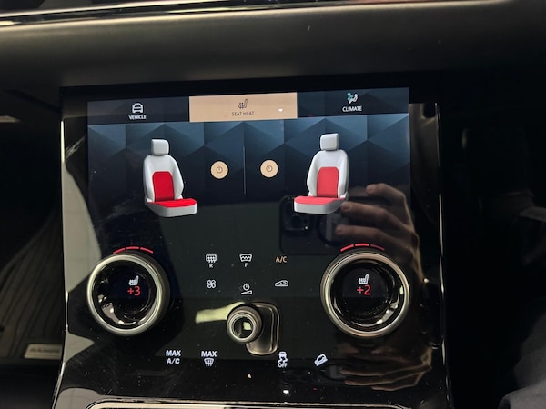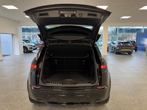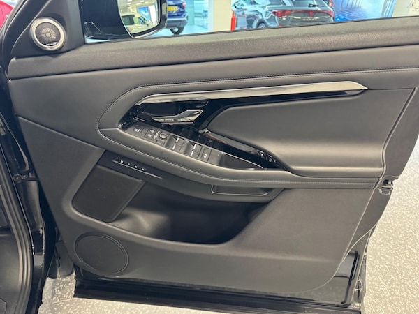 ..3D 360 degree surround camera, Adaptive cruise control, Android Auto, Apple car play, Blind spot assist, Bluetooth connectivity, Brake pad wear indicator warning light, Clear exit monitor, Driver condition monitor, Duo touch pro, Electronic power assisted steering (EPAS), InControl remote, Interactive Driver display instrument cluster, Land Rover InControl apps, Lane keep assist, Pivi pro connected includes upgraded infotainment, connected navigation pro, Nuance speech licence, Powered gesture tailgate/boot lid, Push button starter, Rear collision monitor, Rear traffic monitor, Traffic sign recognition with adaptive speed limiter, Voice control system, Wade Sensing, All terrain progress control, Efficient Driveline, Large fuel tank, Passive suspension, Terrain Response 2 Auto, Digital Audio Broadcast radio-DAB, Steering wheel mounted controls, Automatic headlight levelling, ClearSight interior rear view mirror, Electric windows with one touch open/close and anti trap, Evoque and R-Dynamic badge, Flush deployable exterior door handles, Heated rear window with timer, Heated washer jets, Heated windscreen, Power fold, auto-dimming, heated door mirrors with approach lights and auto dimming driver side, R-Dynamic branding illuminated metal tread plates in loadspace and row 1 with brand name script and non illuminated metal in row 2, Rain sensing windscreen wipers, Rear fog lights, Shadow atlas bonnet and tailgate script, Tailgate spoiler, 40:20:40 split folding rear seats with centre headrest and armrest, Ambient interior lighting, Bright metal pedals, Isofix system on outer rear seats, Overhead lighting console, Overhead stowage for sunglasses, Passive front head restraints, Rear air vents, Rear centre headrest, Satin chrome gearshift paddles, Sunvisors with illuminated vanity mirrors, Twin sliding front centre armrest, 3 rear 3 point seatbelts, Anti-lock braking system (ABS), Customer configurable autolock, DSC - Dynamic Stability Control, Electronic brake force distribution, Electronic parking brake, Electronic traction control, Emergency braking, Front and rear seatbelt reminder, Hill descent control, Hill launch assist, Low traction launch, Power operated child locks, Roll stability control, Six airbags - Driver and passenger airbags/driver knee airbag/front side airbag and curtain airbags, Torque vectoring brake, Tyre pressure monitoring system, Alarm, Immobiliser, Intrusion sensor, Keyless entry, Locking wheel nuts