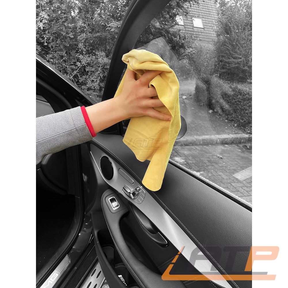 Das P4f Echtledertuch überzeugt durch seine Weichheit, hervorragende Elastizität und Feuchtigkeitsaufnahme, wodurch es enorme Mengen an Wasser aufnehmen kann. Es hinterlässt die Oberfläche makellos, ohne Fusseln oder Streifen. Zudem ist es mühelos auszuwringen und zu verstauen. Im Vergleich zu Kunstleder zeichnet es sich durch eine höhere Widerstandsfähigkeit und Reißfestigkeit aus.