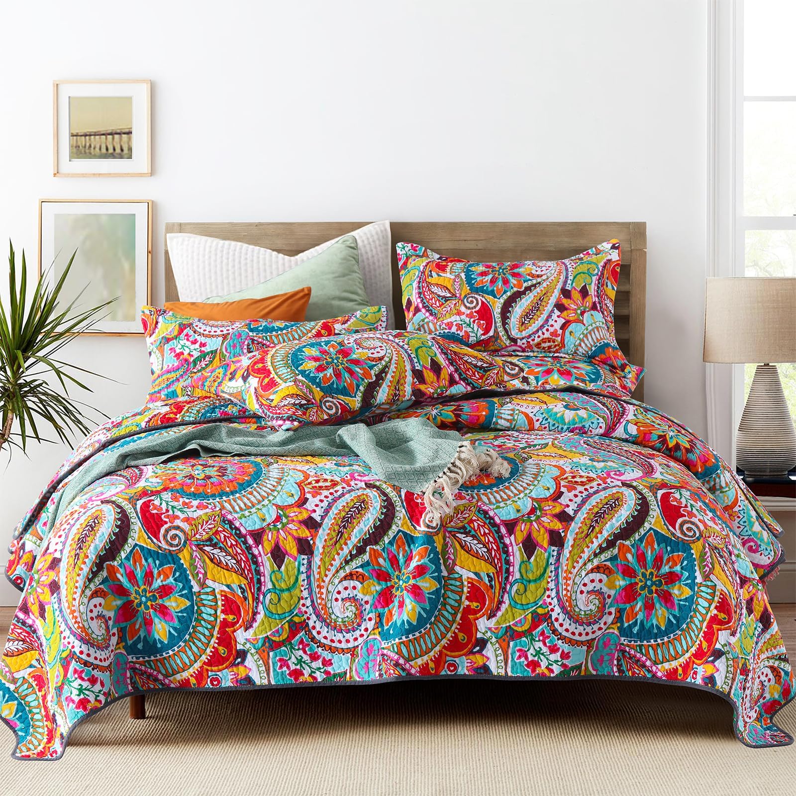 Qucover California King Quilt, Cotton Boho Paisley Quilt, 3 Piece Lightweight Oversized King Bedspread with Pillow Shams, Lightweight Colorful Bedding Comforter Sets, 118x106
