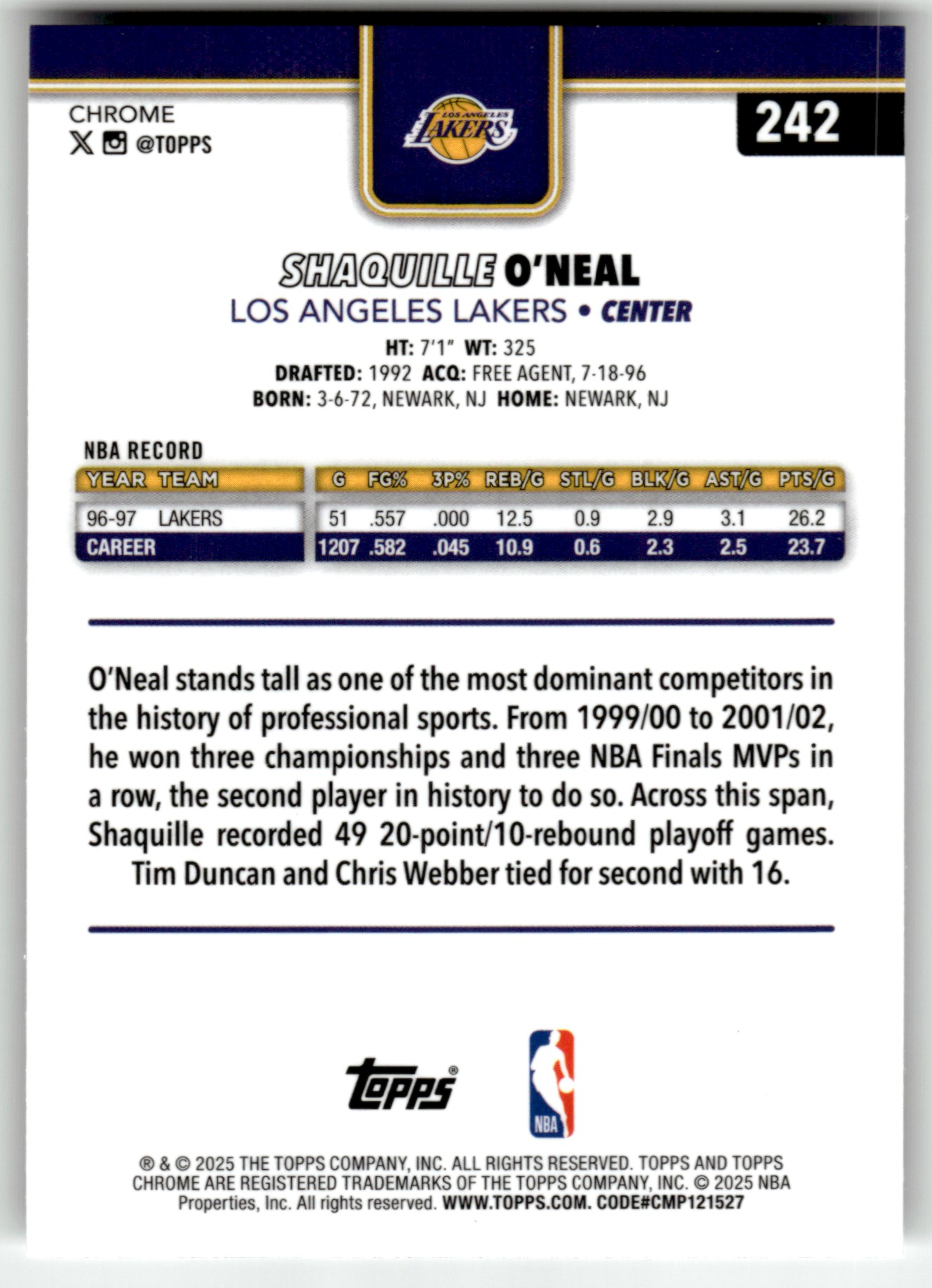 | 2025-26 Topps Chrome Shaquille O'Neal Los Angeles Lakers #242 |