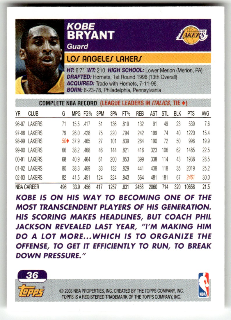 | 2003-04 Topps 1st Edition Kobe Bryant Los Angeles Lakers #36 |