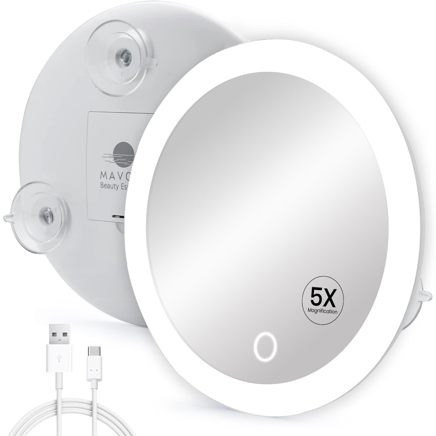 Mavoro 6.8" LED Magnifying Mirror with 3 Strong Suction Cups | 5X Magnification | Portable Lighted Travel Makeup & Cosmetic Mirror with Light (USB-C Rechargeable Built-in Battery | 5X)