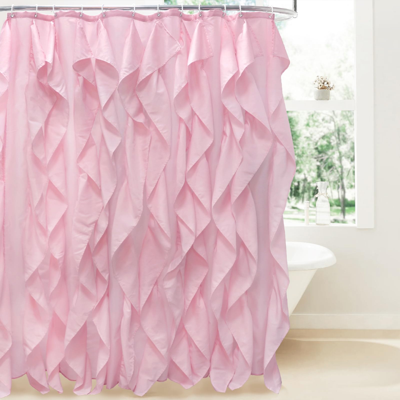 Volens Pink Ruffle Shower Curtain Farmhouse Fabric Cloth Curtains for Bathroom, 72x72 in Long