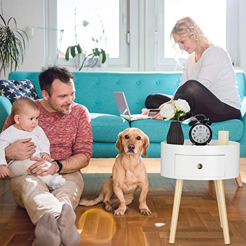 Relaxdays Tavolino Rotondo, con Cassetto, Gambe in Legno, Design Scandinavo, Camera da Letto, HxD 46x38, Bianco Naturale