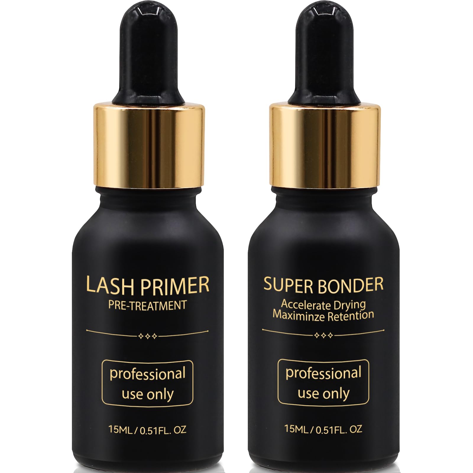 Miuffue Lash Bonder and Primer Kit for Eyelash Extensions, Glue Accelerator Lash Sealant, Eyelash Extension Primer Protein Oil Remover, Adhesive Makeup Tools for Professional Use (15ml+15ml)