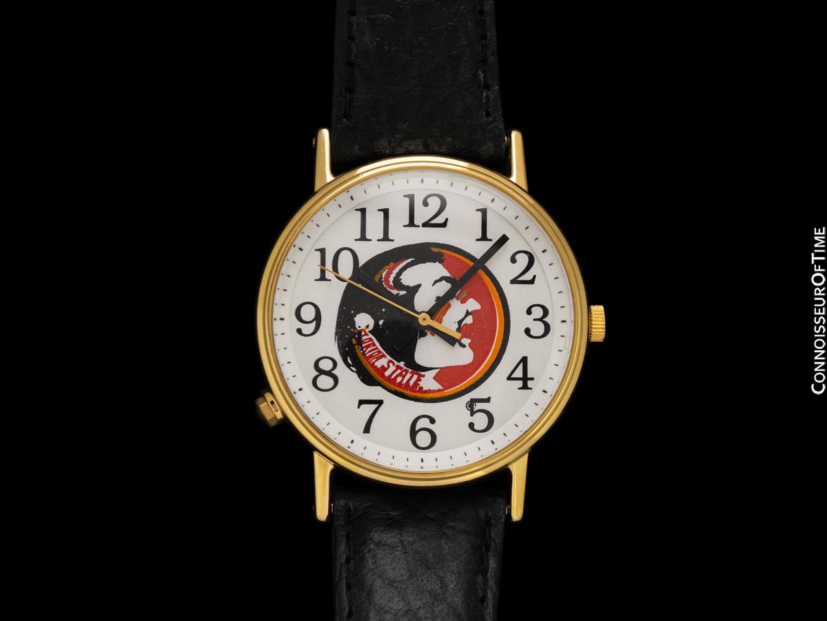 Comporre: Quadrante stampato bianco con numeri arabi completi, minuteria centrale con indici a punti, emblema dei Florida State Seminoles stampato al centro, originale, come nuovo |