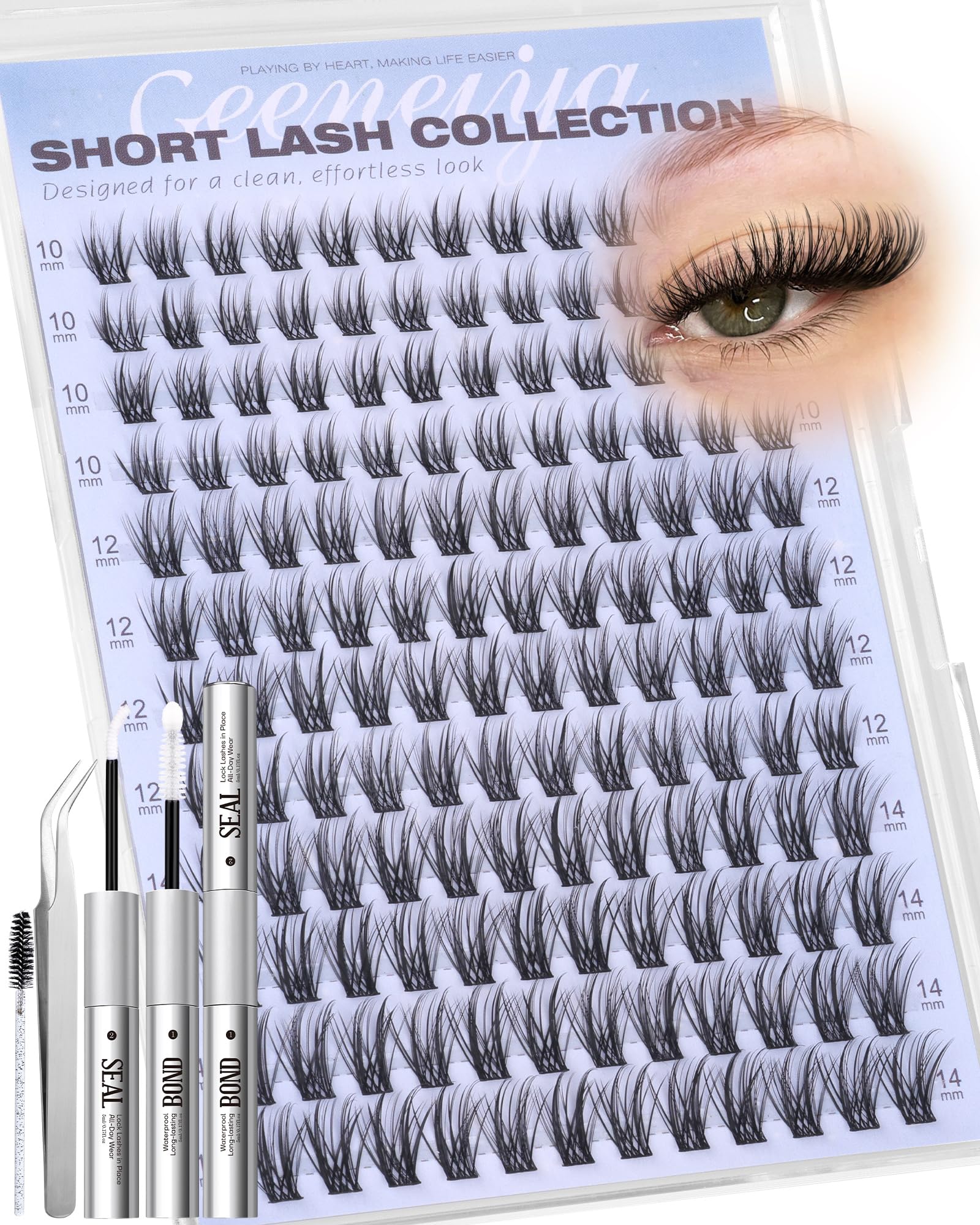 Geeneiya Natural Lash Clusters Kit Short Eyelash Clusters Kit 10-12-14MM Wispy Cluster Lashes C Curl Cluster Eyelash Extensions Clean Girl Makeup Lash Extension Kit with Waterproof Lash Bond and Seal