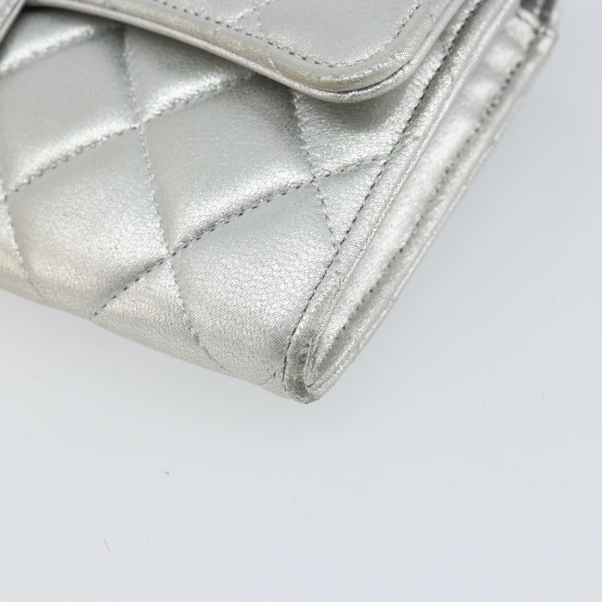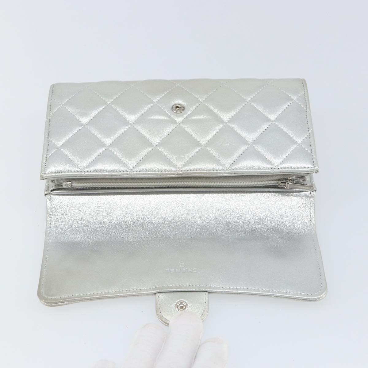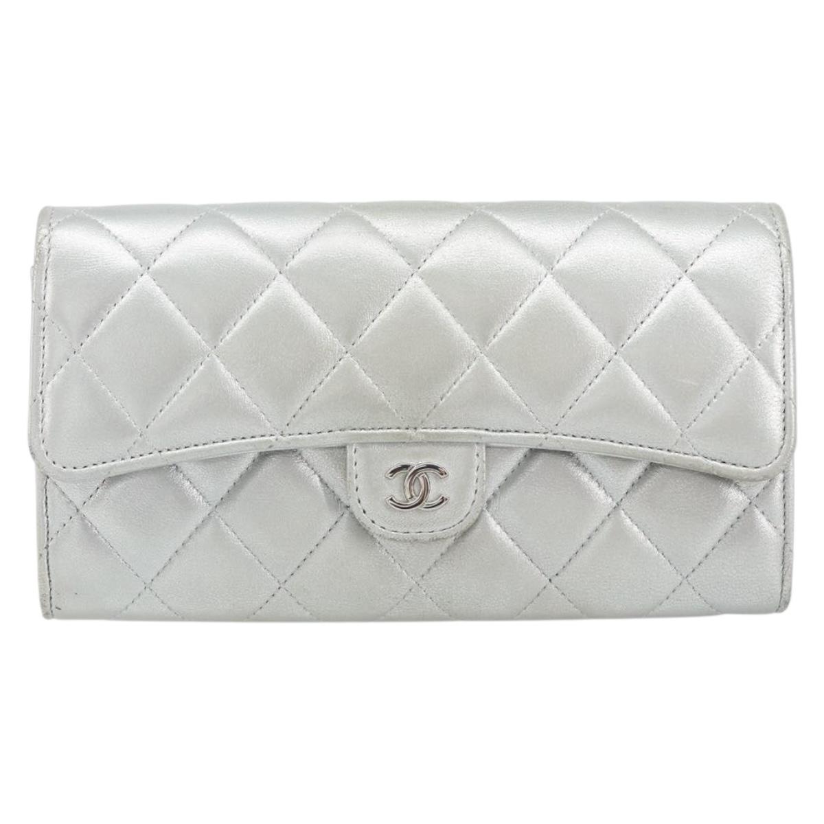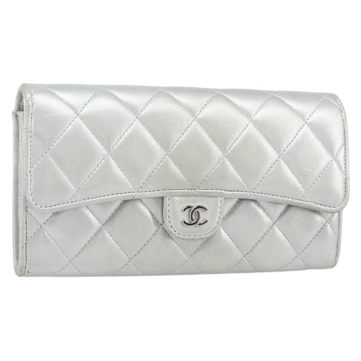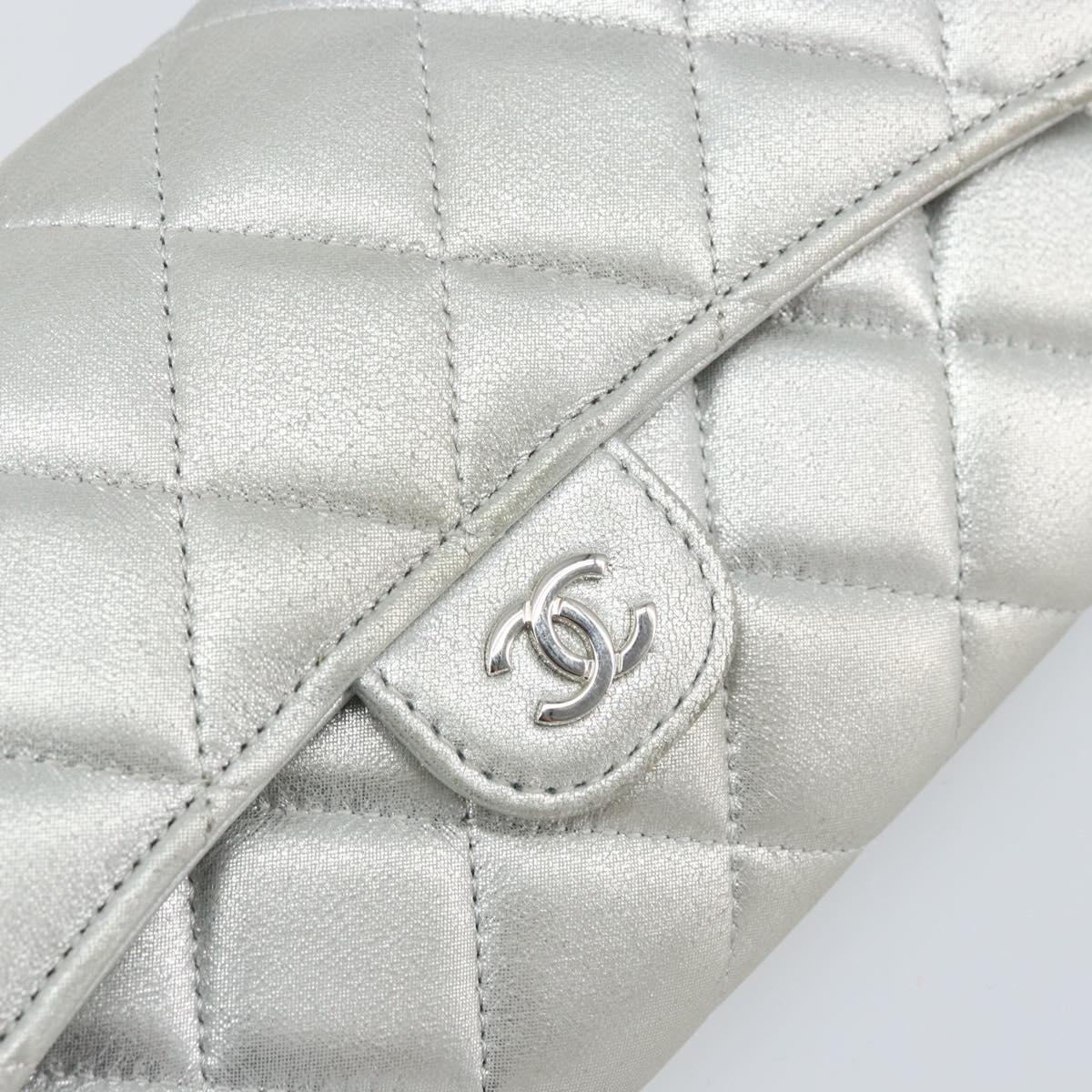 CHANEL Matelasse Long Wallet Lamb Skin Silver CC Auth 168754