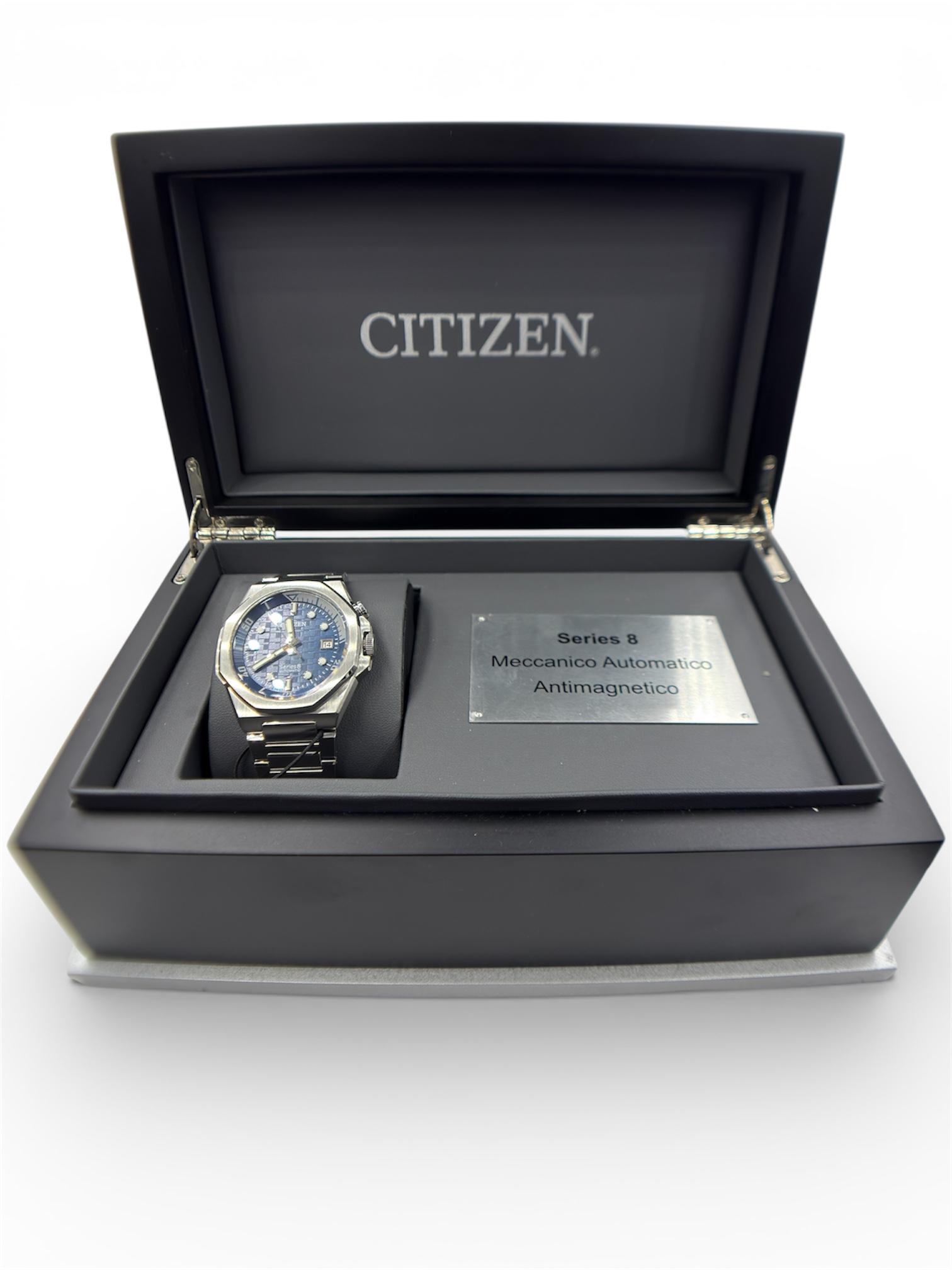 This sophisticated automatic timepiece from Citizen is part of the acclaimed Series 8 collection, designed for precision, durability, and modern style. Crafted in stainless steel, the watch features a bold integrated bracelet and angular case that give it a contemporary, architectural presence on the wrist.