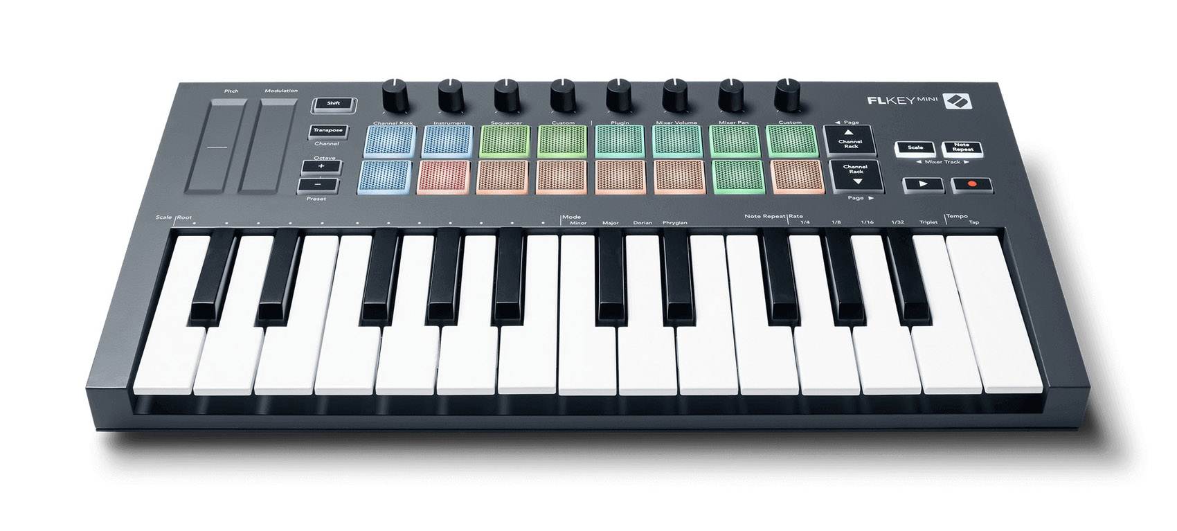 With 25 mini-keys, 16 velocity-sensitive pads, eight customizable pots, and essential transport controls, FLkey Mini puts everything you need right where you need it – so you can stay in the groove.
