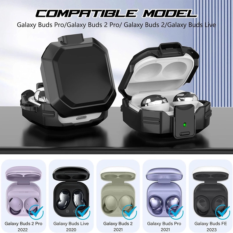 【Materials and Protection】: This cover is made of rugged military-grade hard PC material .The four corners are wrapped with a double-layer air cushion structure. Angle cushion technology protects your Galaxy Buds Live/Pro/2 charging case against bumps, drops and scratches etc.