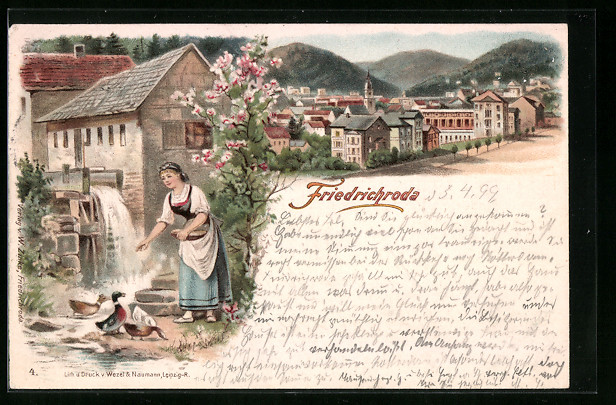 Lithographie Friedrichroda, Blick über die Dächer der Stadt, Magd in Tracht füttert Enten