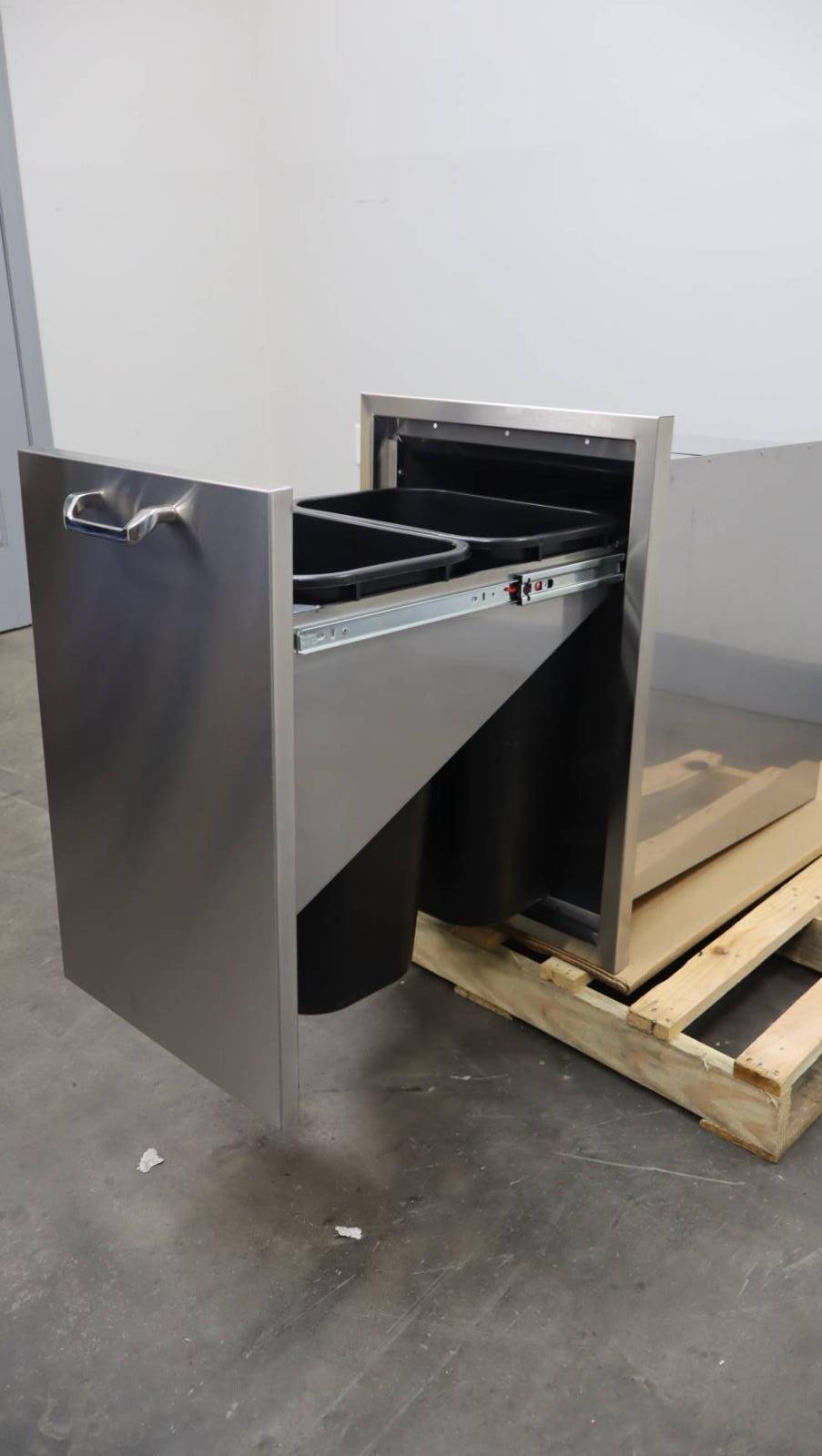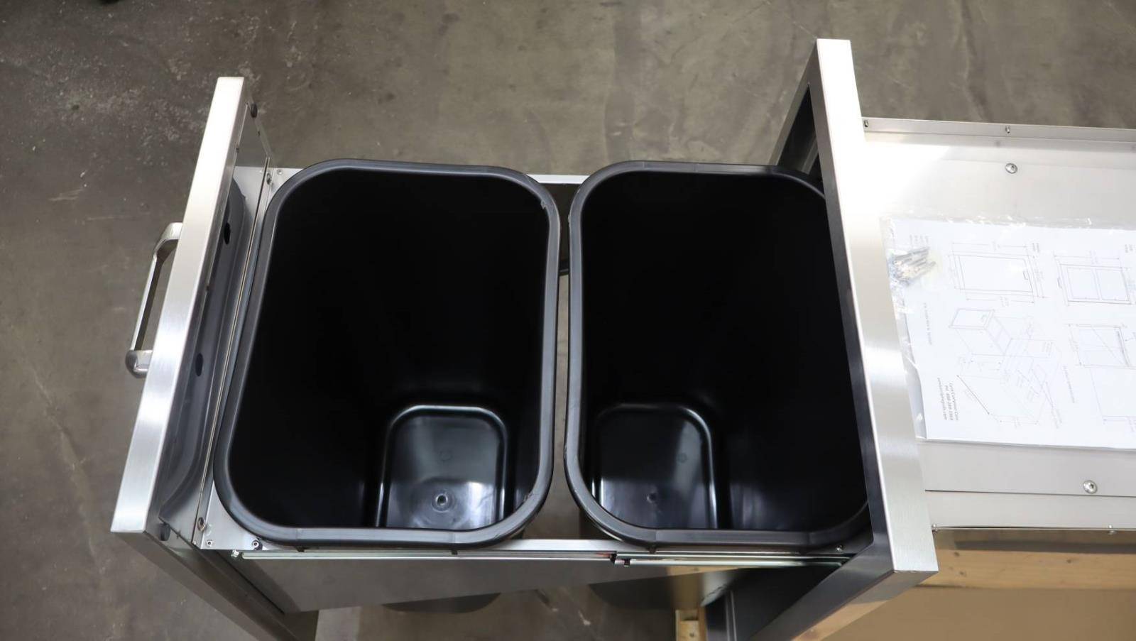 - Includes two removable bins for separate trash and recycling compartments.