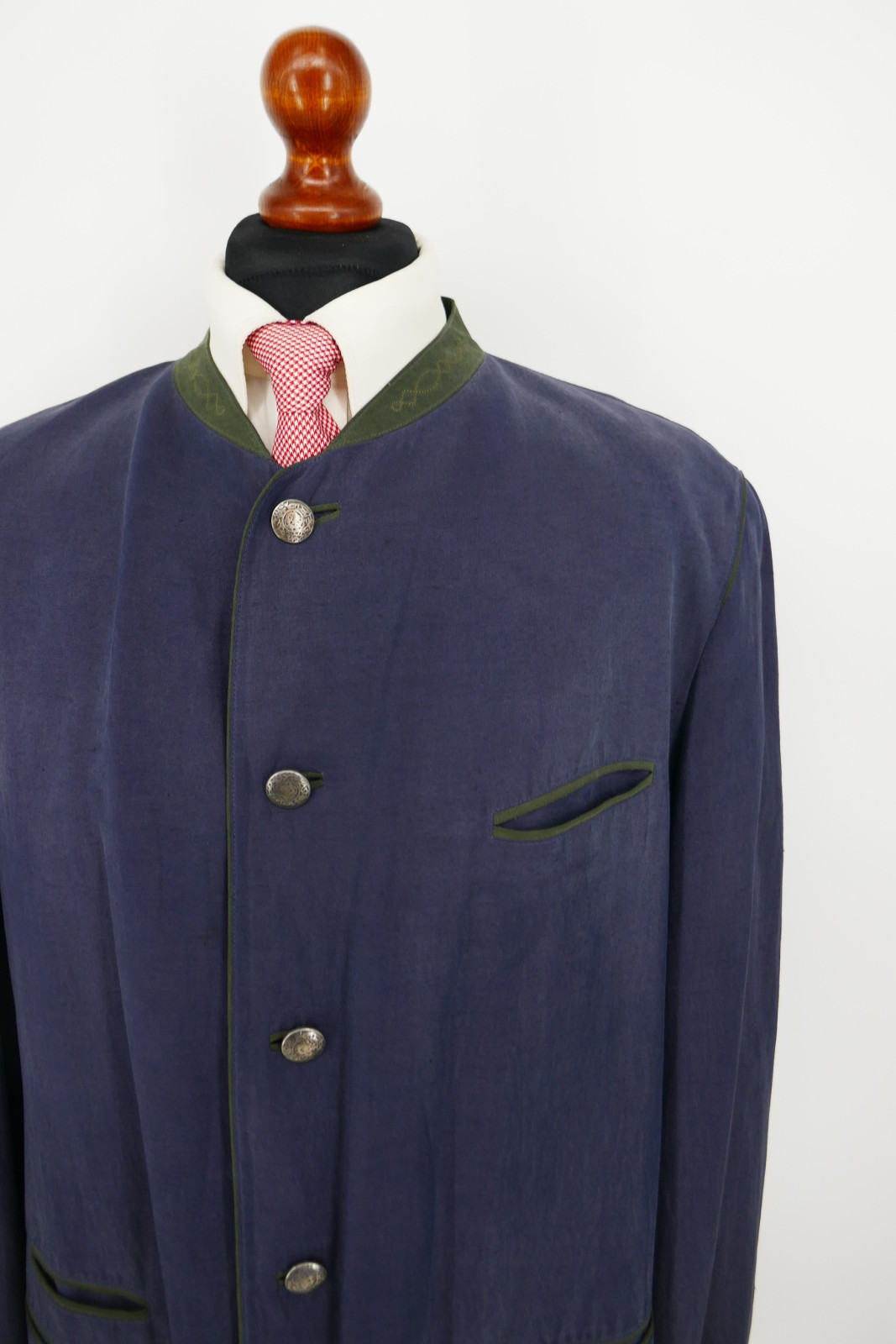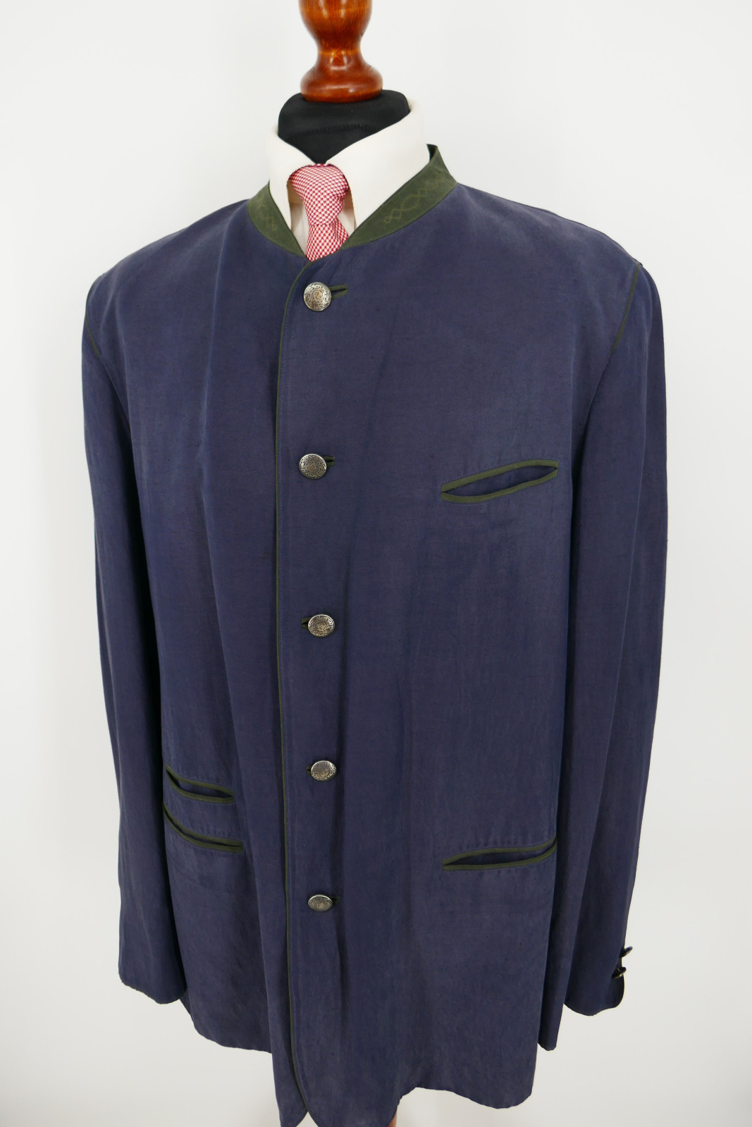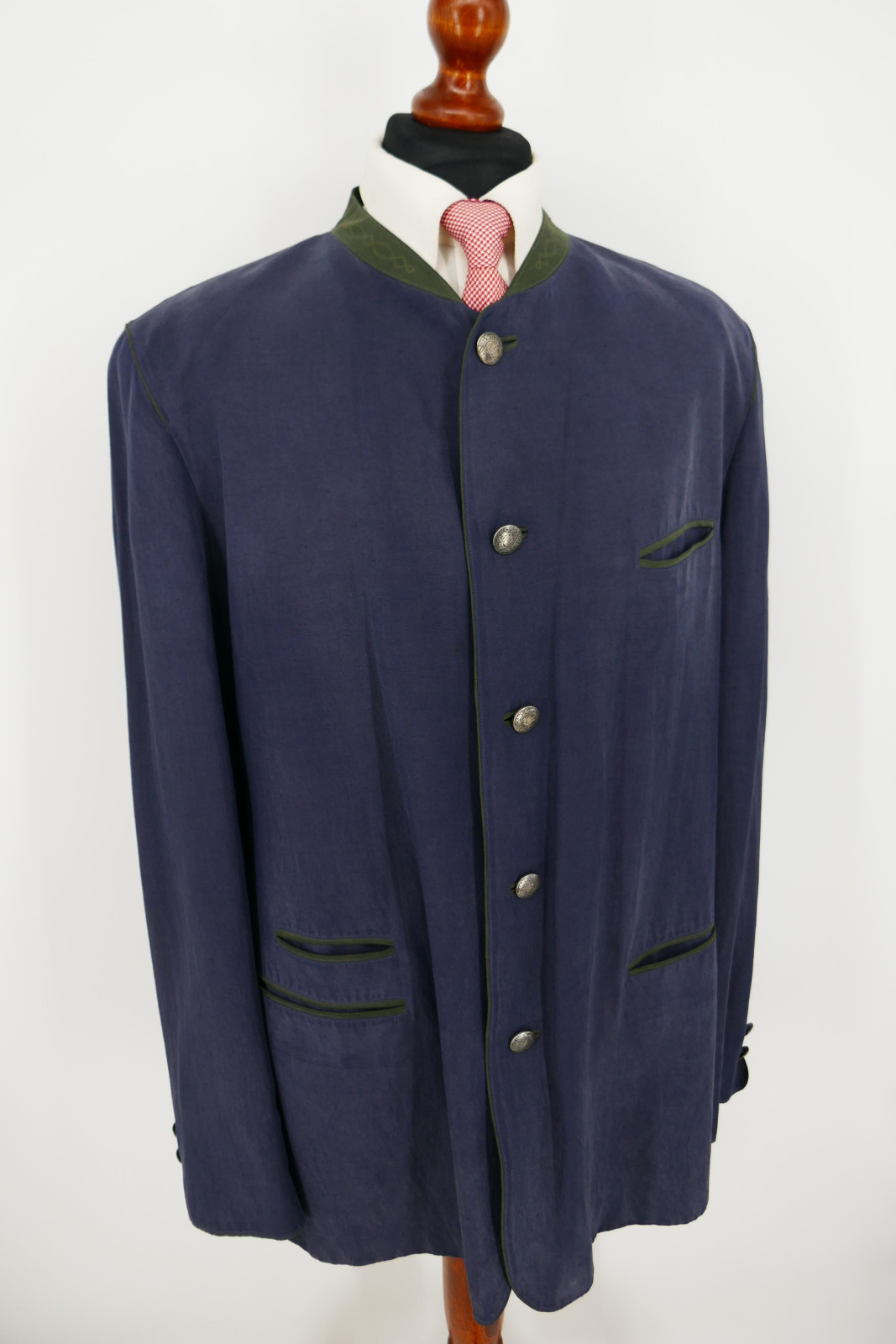 Der Janker ist ein Einreiher. Er ist mit fünf Metall Verschlussknöpfen und ohne Gehschlitz ausgestattet. Die Farbe des Jankers ist ein wunderschönes Dunkelanthrazitblau, siehe Bilder.