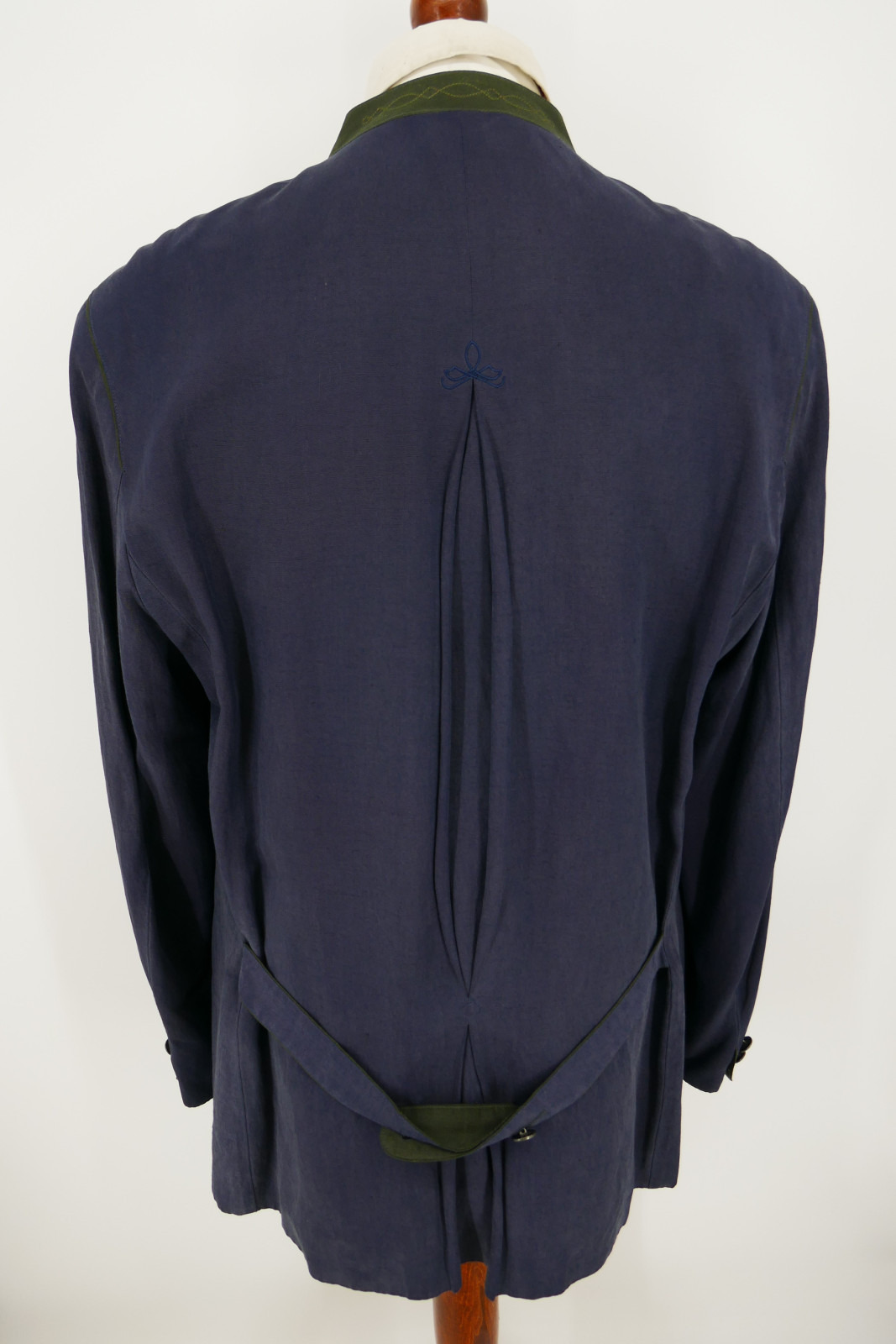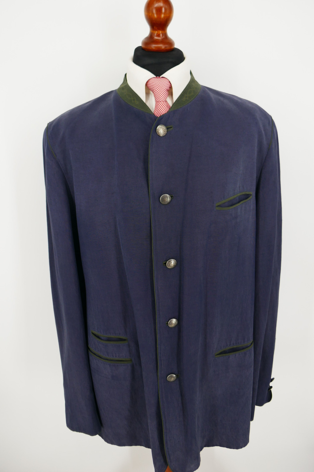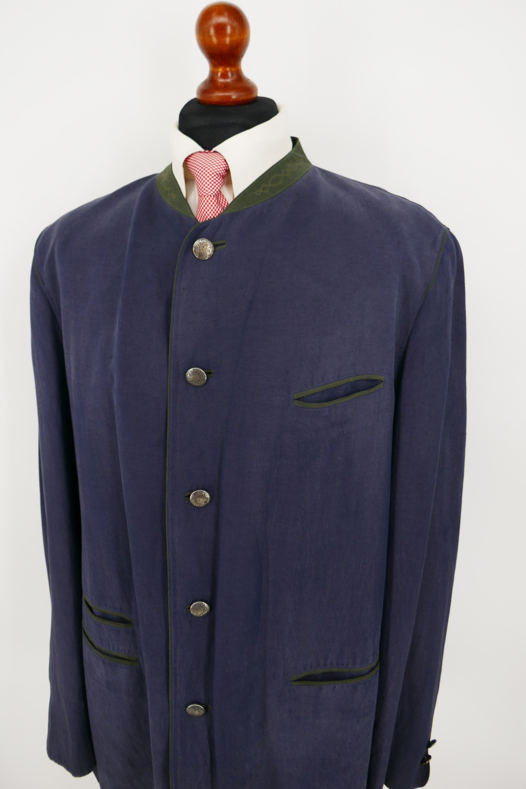 Der Janker ist ein Einreiher. Er ist mit fünf Metall Verschlussknöpfen und ohne Gehschlitz ausgestattet. Die Farbe des Jankers ist ein wunderschönes Dunkelanthrazitblau, siehe Bilder.