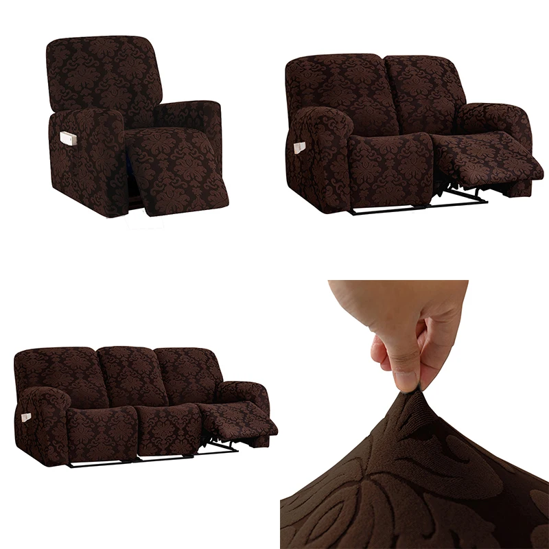 GREAT FITTED: This innovative 1-piece and multi-piece recliner chair couch cover is crafted from durable and soft high stretch knitted jacquard fabric. Suitable for both armchair and recliners. Fit back sitting width between 27-37 inch. with right side handle, pocket and continuous footrest. The seat has two elastic loops at the back corners to be pulled through to the back of the recliner.