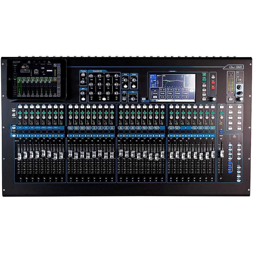 Add the Qu-Pad iPad app to your Qu setup and you’re free to adjust the monitors on stage, roam around the venue whilst tweaking the PA, and then mix the show from the heart of the audience. It also offers a full scene manager, effect parameter control and remote patching and routing capabilities. You'll also enjoy full control over Qu-Drive and DAW transport. Qu-Pad connects to the mixer over Wi-Fi and gives instant access to all live mixing parameters and settings. Qu-Pad requires the connection of a Wi-Fi router or access point to the Qu-32 Network port.
