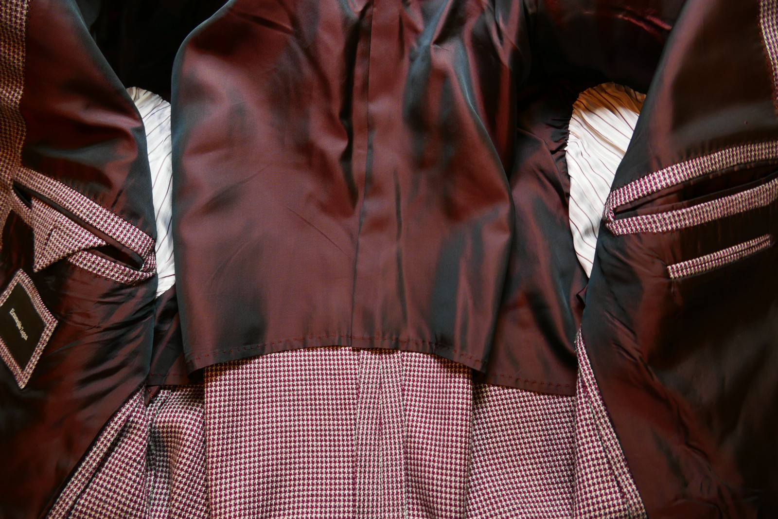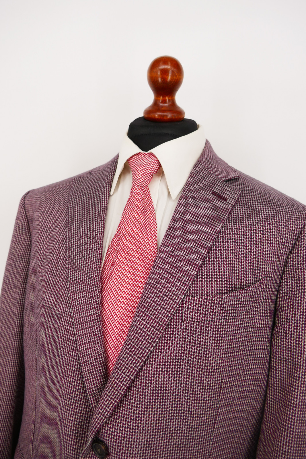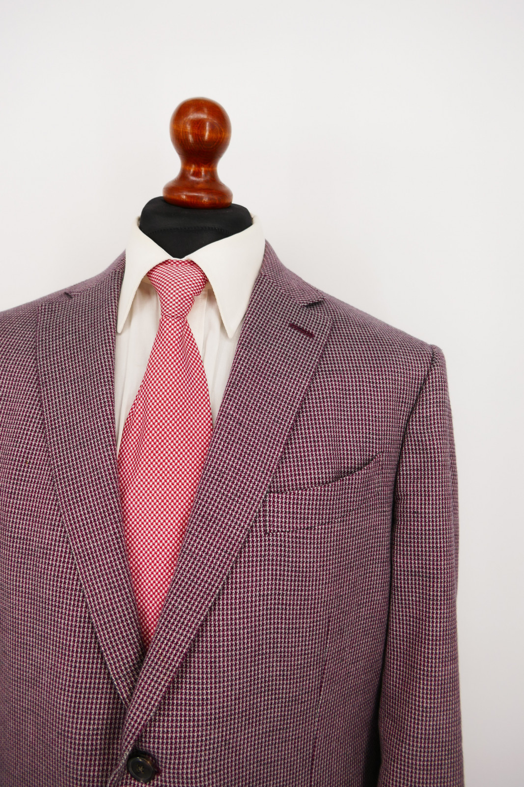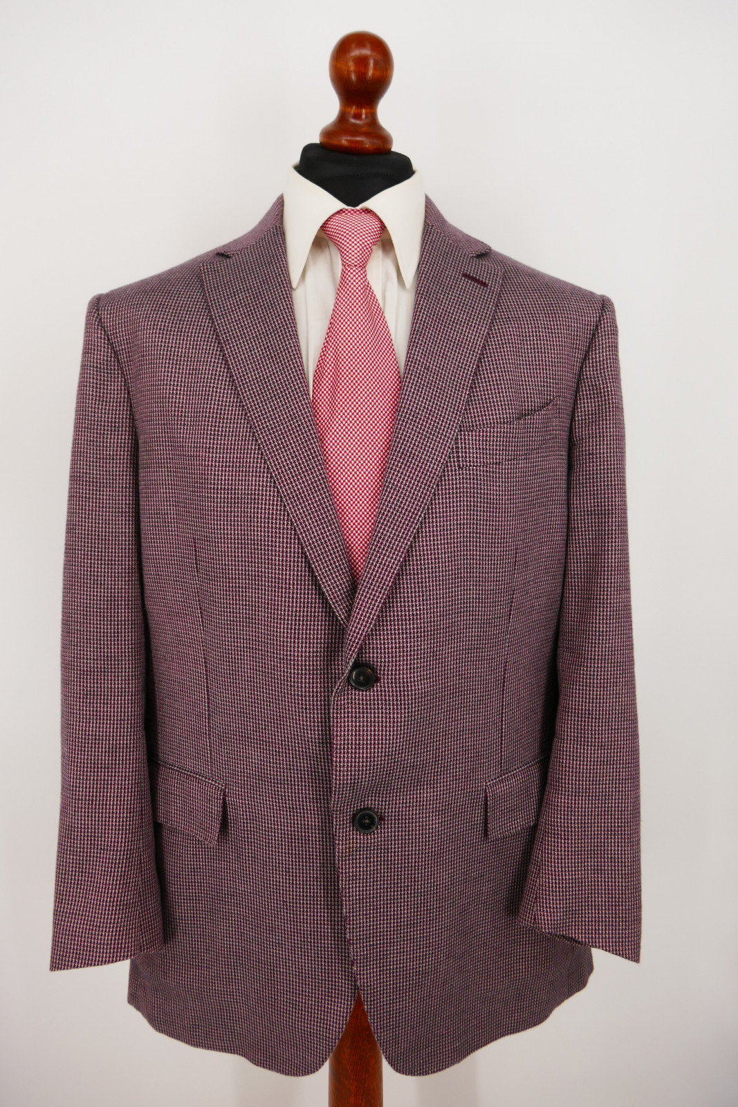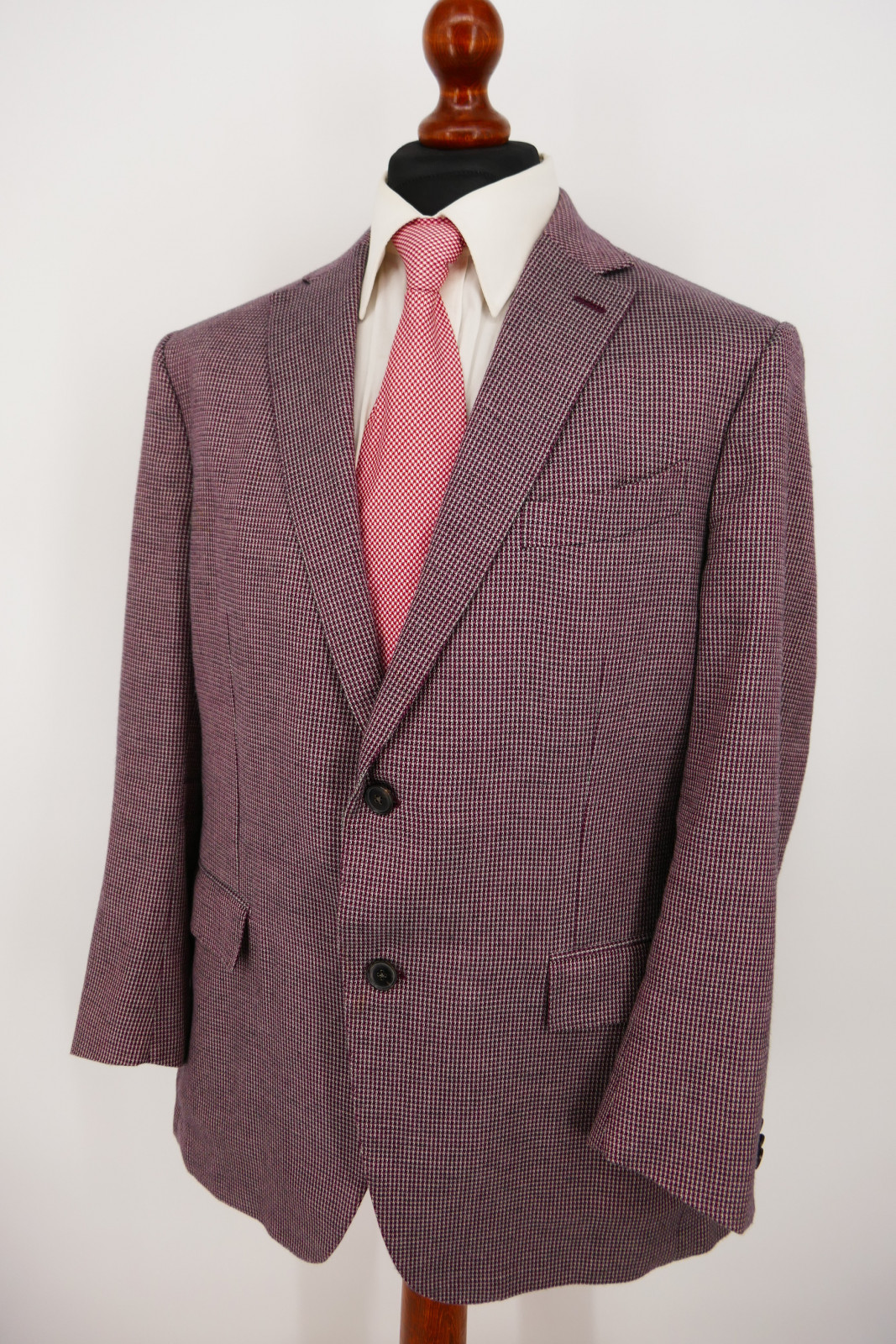 Das Sakko ist ein Einreiher. Es ist mit zwei Verschlussknöpfen und doppeltem Gehschlitz ausgestattet. Die Farbe des Sakko ist ein wunderschönes Weinrot + Grau gemustert, siehe Bilder.