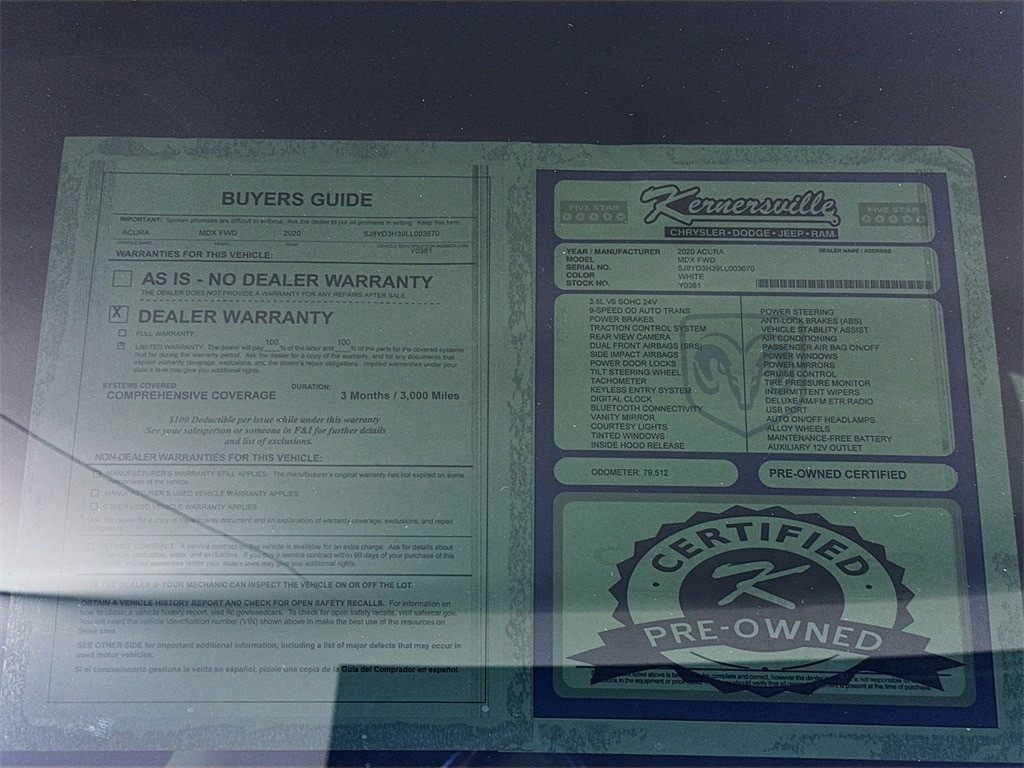 When calling or emailing, please reference stock number Y0361.MORE ABOUT THIS 2020 Acura MDX 3.5L SUV Certified Pre Owned! Clean Carfax! One Owner! Standard Trim! 3.5L V6 Engine! 9 Speed Automatic Transmission! Front Wheel Drive! Collision Mitigation Braking System! Adaptive Cruise Control With Steering Assist! Lane Keeping Assist System! Forward Collision Warning! Rear View Backup Camera! Automatic High Beam Headlamps! Power Tilt And Slide Sunroof! Heated Front Seats! Leather Trimmed Interior! Dual Zone Automatic Climate Control! Power Adjustable Front Seats! Push Button Start! Keyless Entry! Bluetooth Connectivity! Premium Audio System! Steering Wheel Mounted Audio Controls! This 2020 Acura MDX offers a refined blend of performance, safety, and versatility in a spacious three row SUV design. Powered by a smooth and capable 3.5L V6 engine paired with a 9 speed automatic transmission, it delivers confident acceleration and a comfortable front wheel drive ride for daily driving and long trips. Advanced safety features include collision mitigation braking, adaptive cruise control with steering assist, lane keeping assist, forward collision warning, and a rear view backup camera to enhance driver confidence. The interior is thoughtfully designed with heated leather trimmed front seats, power adjustable seating, dual zone automatic climate control, and a power sunroof that adds natural light to the cabin. Technology highlights include Bluetooth connectivity, a premium audio system, steering wheel mounted controls, push button start, and keyless entry. With seating for seven passengers, a clean one owner history, and Certified Pre Owned status, this Acura MDX is an excellent choice for families seeking comfort, reliability, and premium features. Kernersville Chrysler Dodge Jeep Ram is the LARGEST truck dealer in the Southeast for two years in a row. We have the largest selection of trucks and over 1900 vehicles in stock at all times. We aim to truly be the lowest priced in the market and we do so by price checking our inventory every day and dropping our price to remain in the TOP 3 LOWEST PRICED. Shop at the most convenient dealer in the USA, available online! Shop at Kernersville Chrysler Dodge Jeep Ram! Hablamos Espanol - llame hoy.