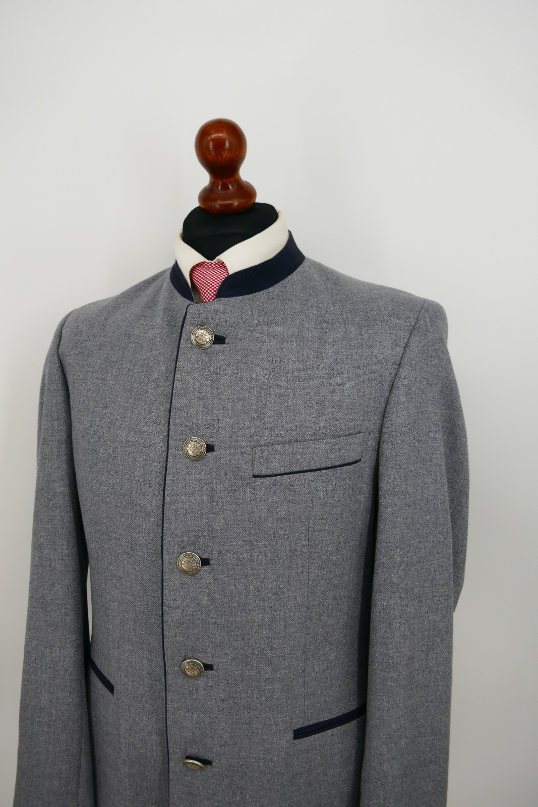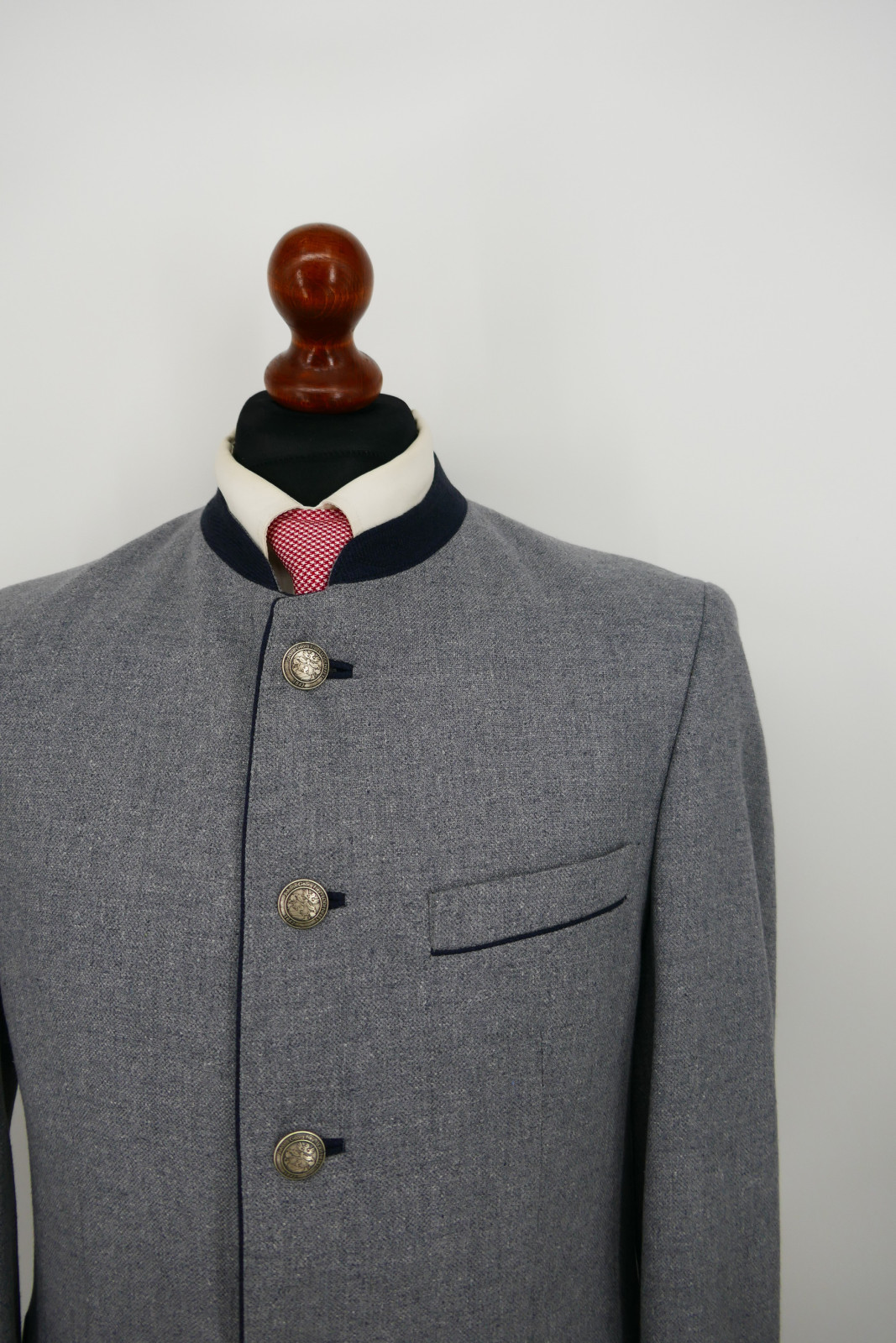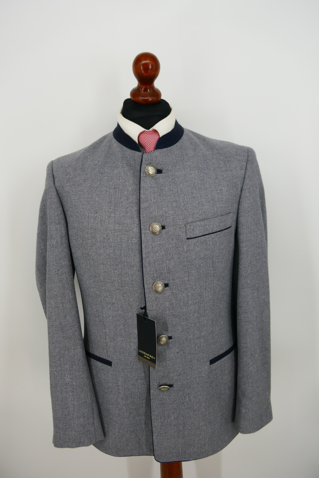 Der Janker ist ein Einreiher. Er ist mit fünf Metall Verschlussknöpfen und ohne Gehschlitz ausgestattet. Die Farbe des Jankers ist ein wunderschönes Anthrazitgrau fein gemustert, siehe Bilder.