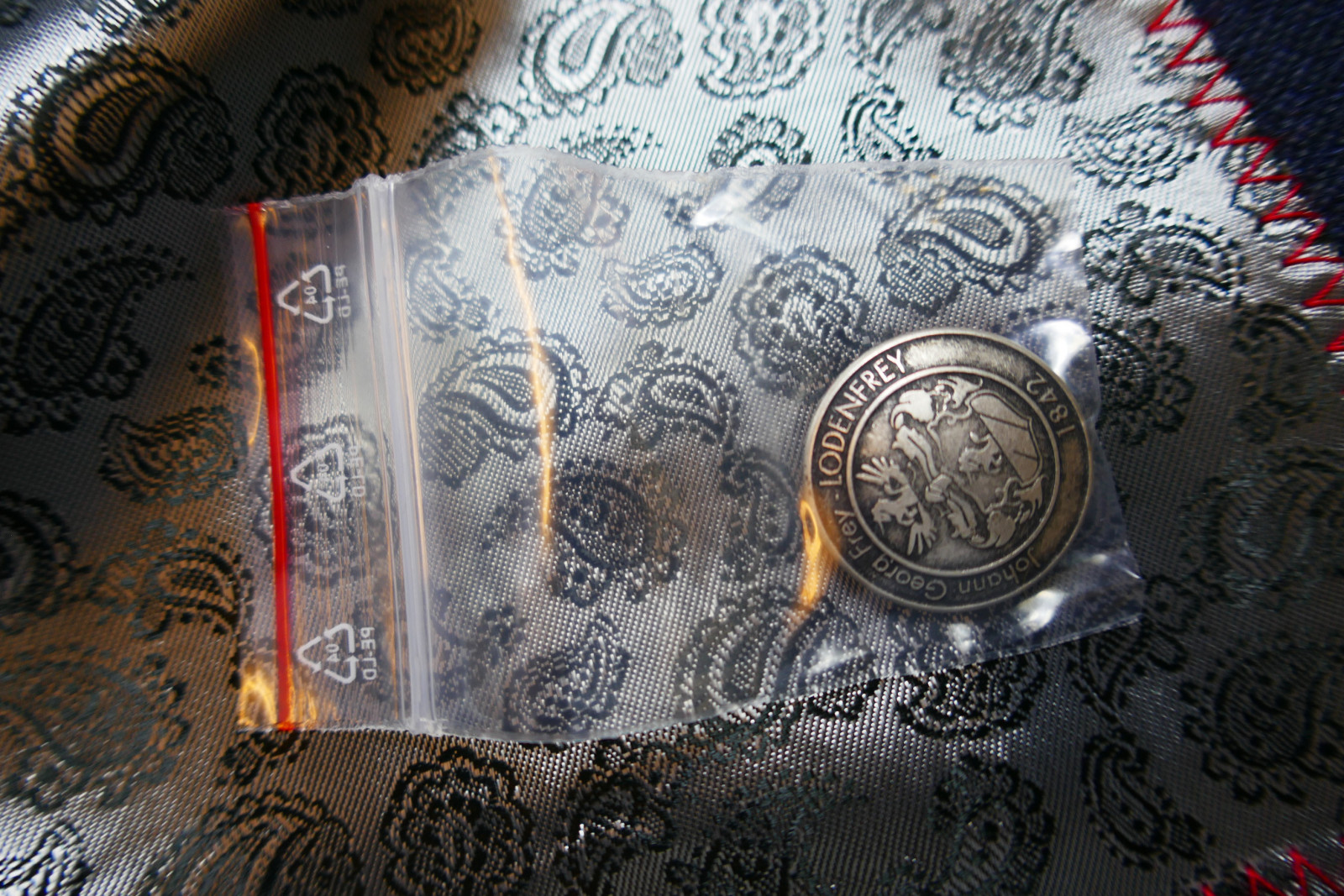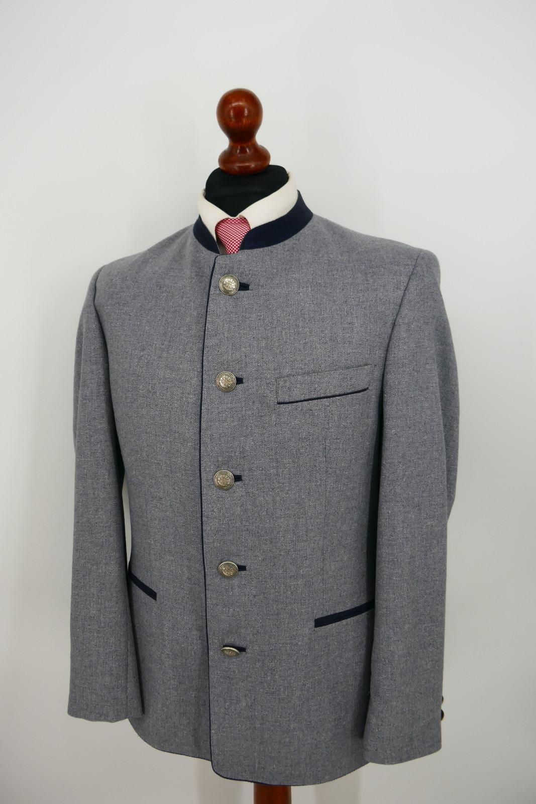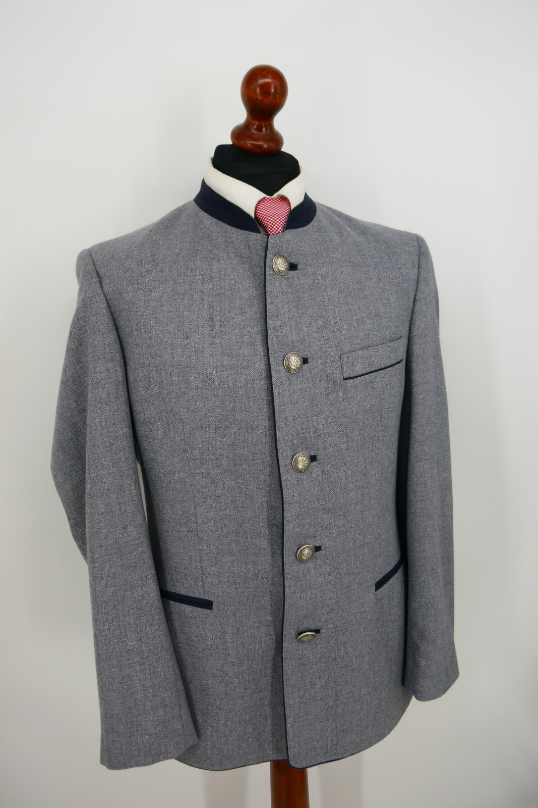 Der Janker ist ein Einreiher. Er ist mit fünf Metall Verschlussknöpfen und ohne Gehschlitz ausgestattet. Die Farbe des Jankers ist ein wunderschönes Anthrazitgrau fein gemustert, siehe Bilder.