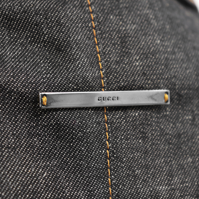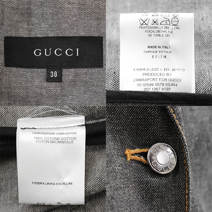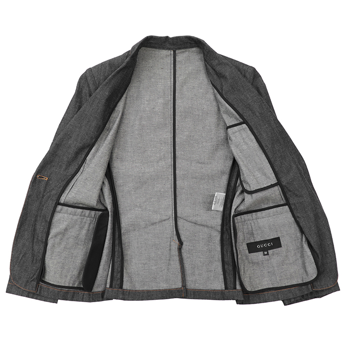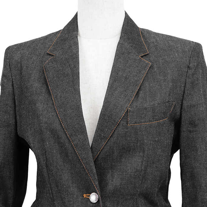 | Series | GUCCI denim tailored jacket, size 38, women's, notched lapel, logo buttons, 1-button, outerwear, accessories included, charcoal. |