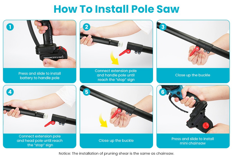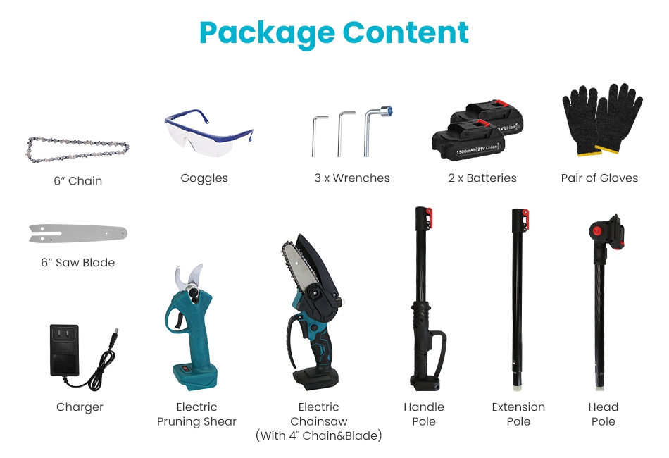 GOOD QUALITY Product Detail Image Gallery Product DescriptionOverview:Our Extendable cordless chainsaw & pruning shear kit is a great garden tools to help you cut wood and shape garden efficiently and effortlessly. 2Pcs 2000mAh rechargeable batteries allow you to do the job continuously up to 40mins working. Powerful motor with high-efficiency performance delivers 26.24ft/s chain speed and 0.98in maximum cutting diameter. You can assemble the chainsaw and pruning shear to different length by the 3.7ft/5.5ft extension poles according to your needs. A must have tool for household, garden, yard, or farm projects and a perfect gift for your dad, friends, husband and horticulturist. Features:- 4 In 1 Garden Tool Set:Package includes pruning shear and chainsaw with extension poles,this 4-in-1 multifunctional garden tool set can be used as a handheld chainsaw,handheld pruning shear,pole saw,pole shear. Besides,2 adjustable pole lengths(3.7ft/5.5ft) allow for effortless trimming of high-reaching branches without ladder,and 7 adjustable head angles(-90°/-75°/-45°/0°/45°/75°/90°) make garden shaping work more flexible and precise .