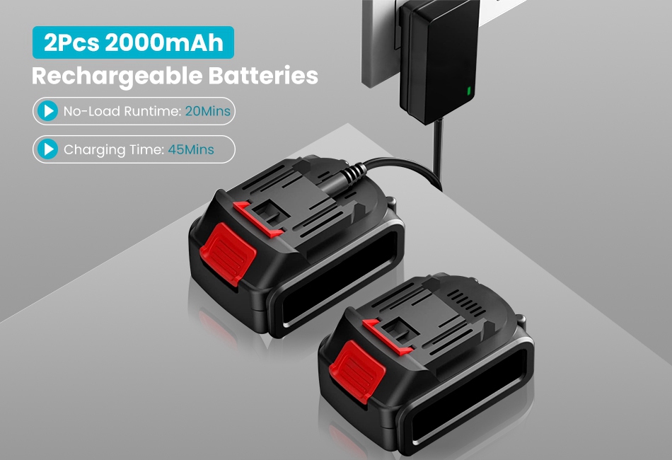 - Cordless & Lightweight Design:Powered by 2Pcs 2000mAh rechargeable batteries,supporting total of 40mins no-load working time after fully charged,suitable for extended use during gardening sessions without frequent interruptions. Moreover,its lightweight and cordless design eliminates the hassle of tangled cords or limited mobility,ensuring effortless wood cutting,tree pruning and gardening without a sore hand.