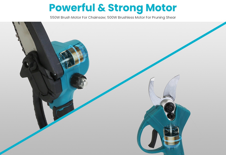 - High-Efficiency Working Performance:Adopts 550W brush motor for chainsaw and 500W brushless motor for pruning shear,powerful and strong motor achieves maximum 24.24ft/s chain speed and .98in maximum cutting diameter. Come with 4in/6in chain and sk5 carbon steel blade,enabling swift cuts through various types of wood with ease.