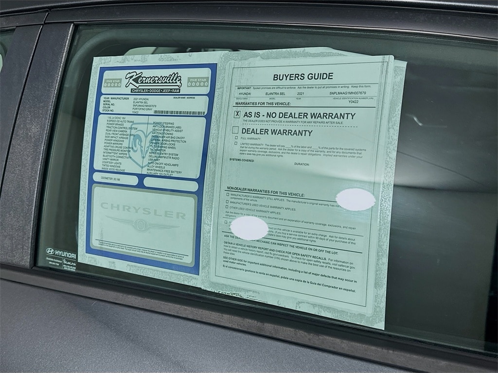 When calling or emailing, please reference stock number Y0422.MORE ABOUT THIS 2021 Hyundai Elantra SEL Sedan Certified Pre Owned! Clean Carfax! One Owner! Smartstream 2.0L Engine! Intelligent Variable Transmission! Forward Collision Avoidance Assist! Blind Spot Collision Avoidance Assist! Lane Keeping Assist! Rear Cross Traffic Collision Avoidance Assist! 8 Inch Touchscreen Display! Wireless Apple CarPlay And Android Auto! Proximity Key With Push Button Start! Rearview Camera With Dynamic Guidelines! Dual Automatic Temperature Control! 16 Inch Alloy Wheels! This 2021 Hyundai Elantra SEL delivers impressive efficiency, advanced safety technology, and modern connectivity in a sleek sedan design. Powered by a Smartstream 2.0L 4 cylinder engine paired with an Intelligent Variable Transmission, it offers smooth performance and excellent fuel economy. Safety is enhanced with Forward Collision Avoidance Assist with pedestrian detection, Blind Spot Collision Avoidance Assist, Rear Cross Traffic Collision Avoidance Assist, Lane Keeping Assist, Lane Following Assist, Driver Attention Warning, and a rearview camera with dynamic guidelines. Inside, enjoy an 8 inch high resolution touchscreen with wireless Apple CarPlay and Android Auto integration, Bluetooth hands free connectivity, SiriusXM capability, proximity key with push button start, dual automatic temperature control, a 4.2 inch color TFT cluster display, steering wheel mounted audio and cruise controls, and comfortable seating with driver height adjustment and folding rear seatback. Stylish 16 inch alloy wheels and projector headlights with LED daytime running lights complete the look, making this Elantra SEL a well equipped and dependable daily driver. Kernersville Chrysler Dodge Jeep Ram is the LARGEST truck dealer in the Southeast for two years in a row. We have the largest selection of trucks and over 1900 vehicles in stock at all times. We aim to truly be the lowest priced in the market and we do so by price checking our inventory every day and dropping our price to remain in the TOP 3 LOWEST PRICED. Shop at the most convenient dealer in the USA, available online! Shop at Kernersville Chrysler Dodge Jeep Ram! Hablamos Espanol - llame hoy.