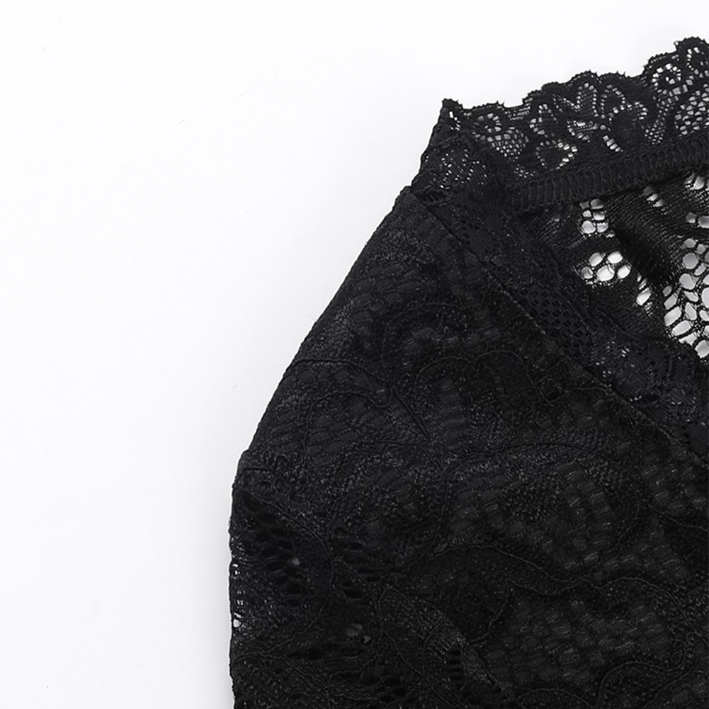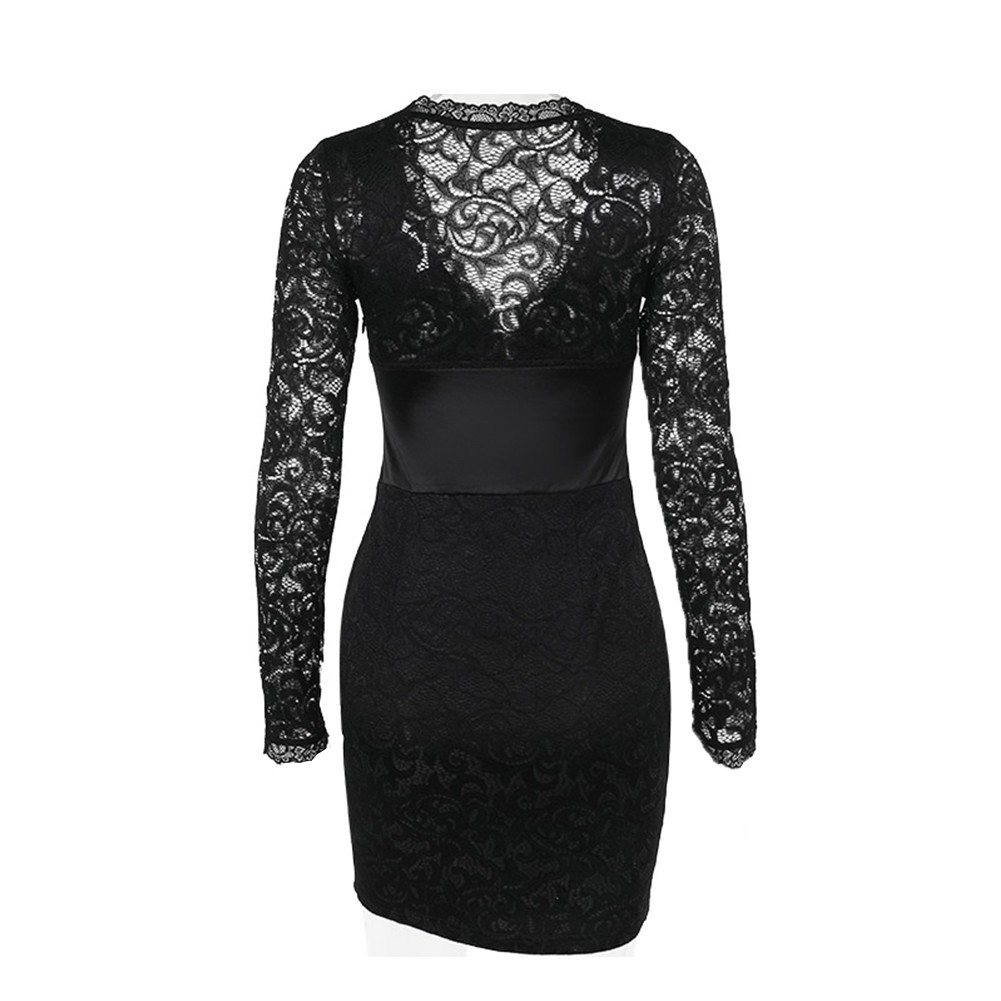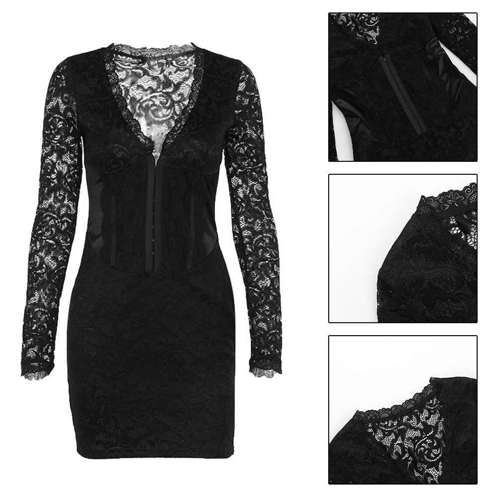 Abito donna elegante e alla moda manica lunga pizzo scollo a V colore nero