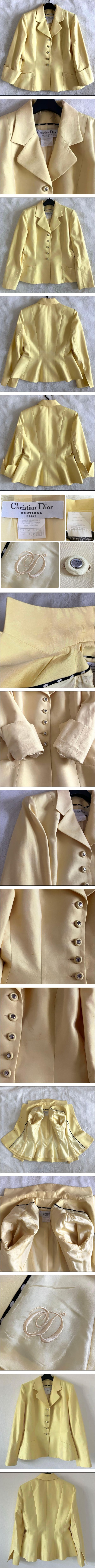 This is a vintage Christian Dior Galliano-era cotton-silk single-breasted, long-sleeved bar jacket with logo button closure, a tailored dress jacket.