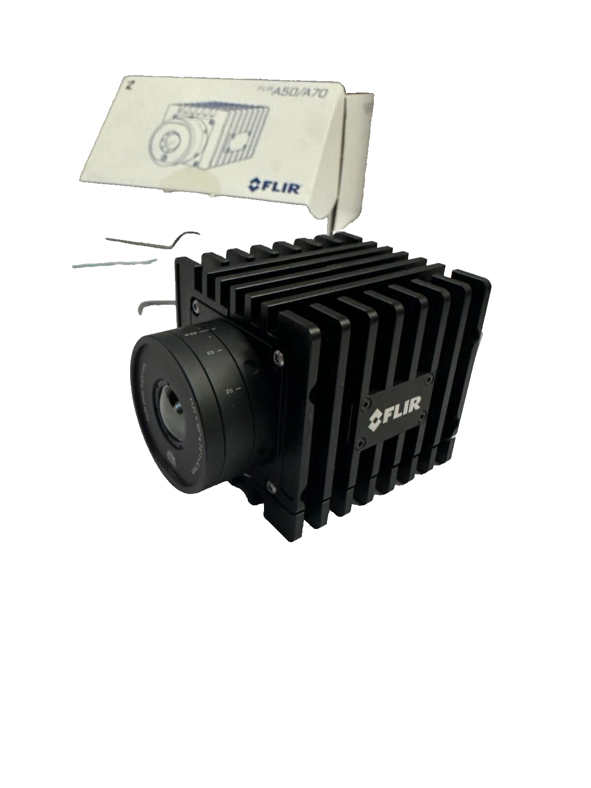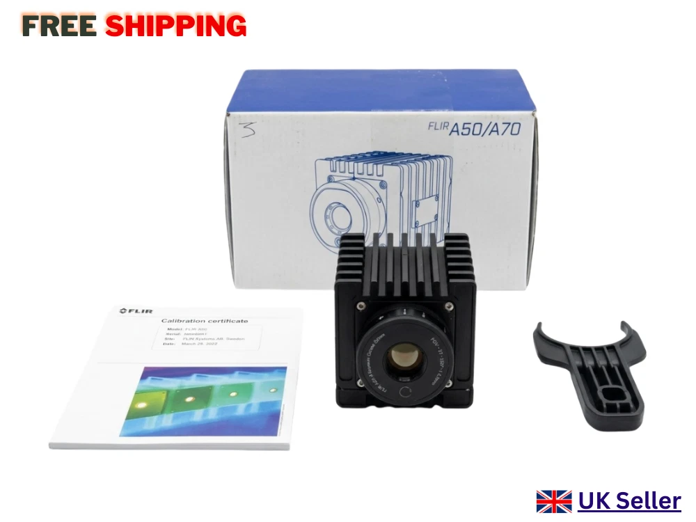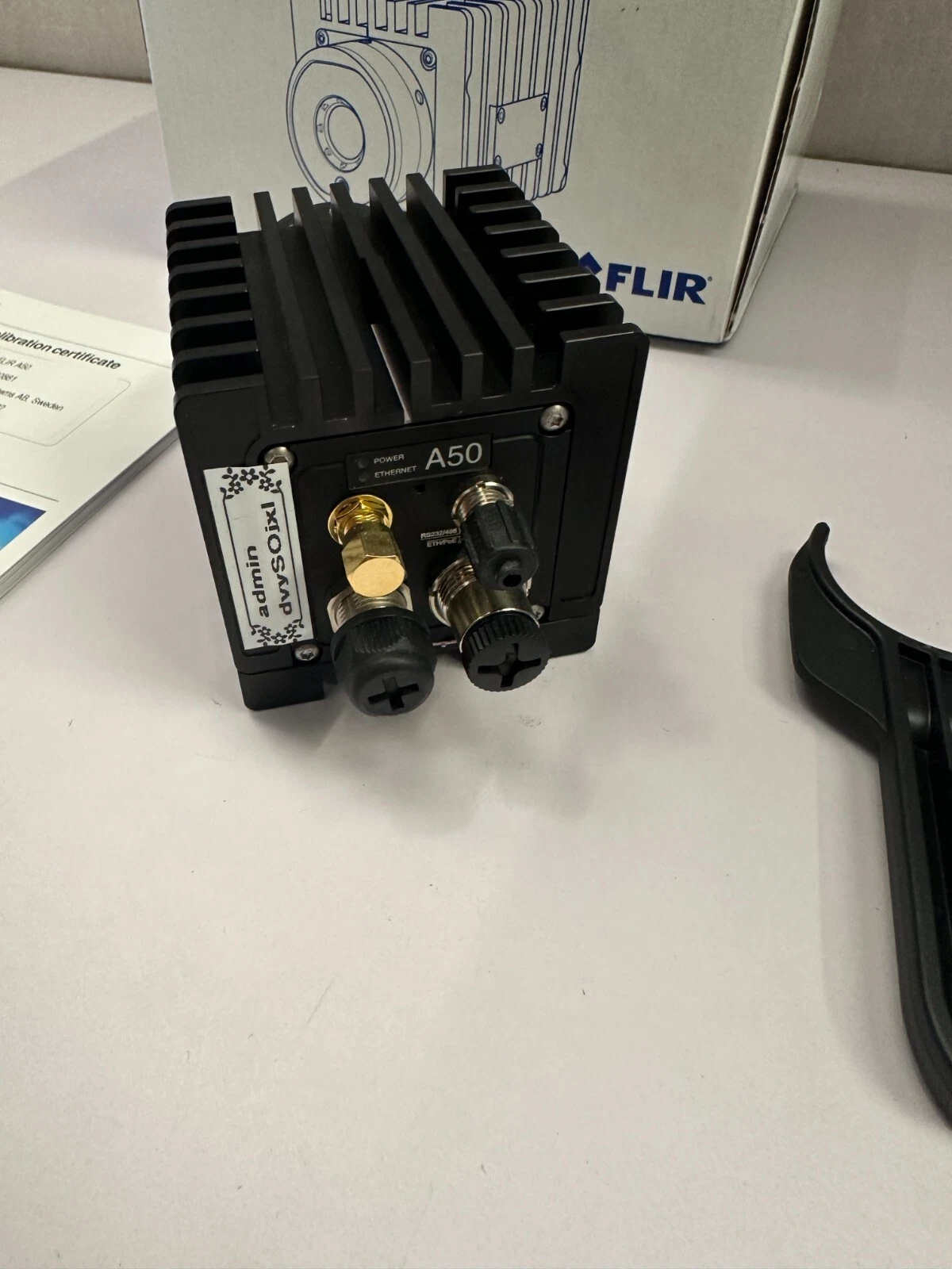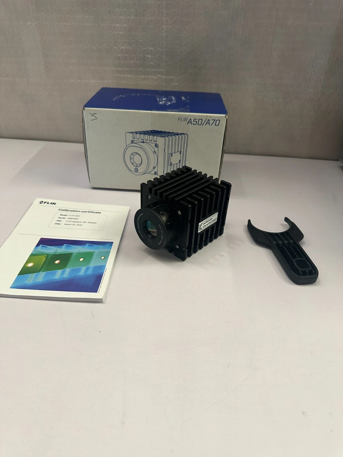 FLIR A50 fixed thermal imaging camera, supplied with original FLIR A50/A70 box, calibration certificate, and adjustment tool.