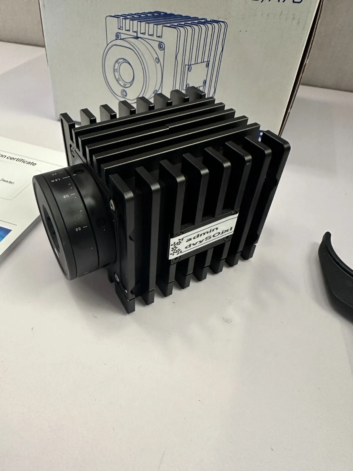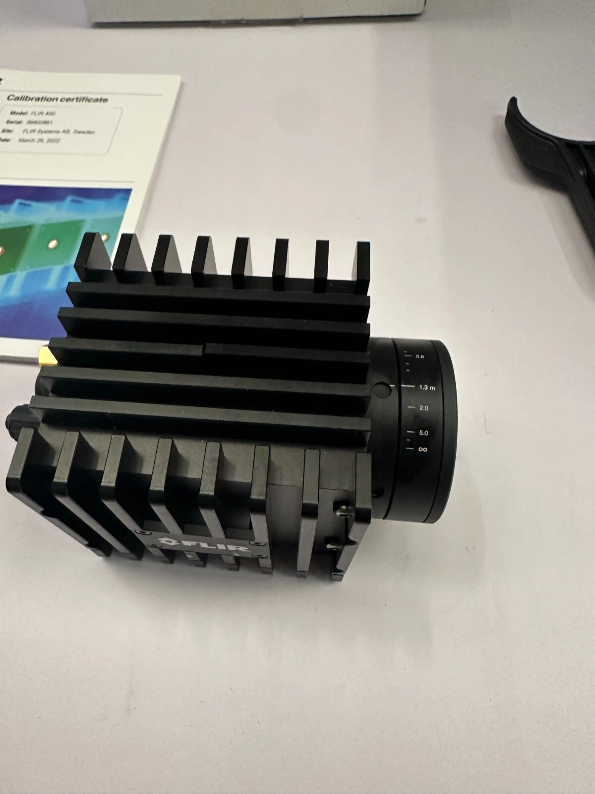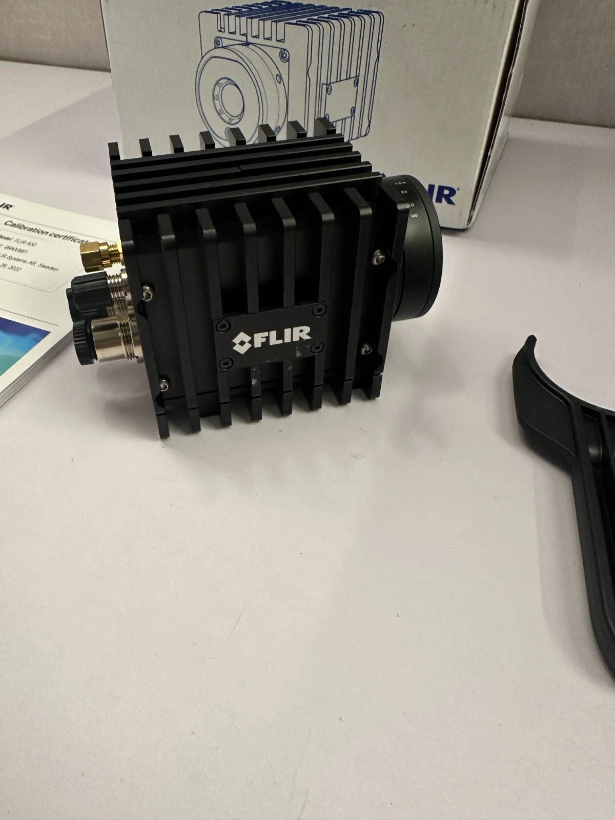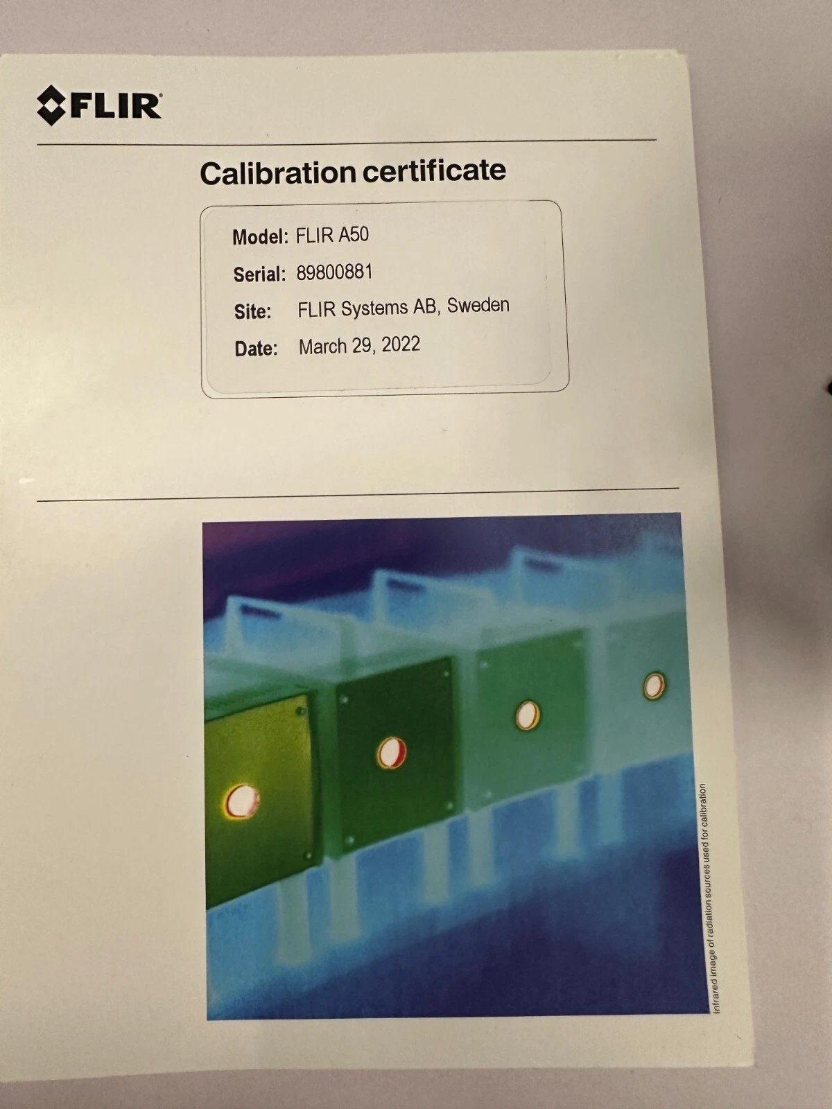 FLIR A50 fixed thermal imaging camera, supplied with original FLIR A50/A70 box, calibration certificate, and adjustment tool.