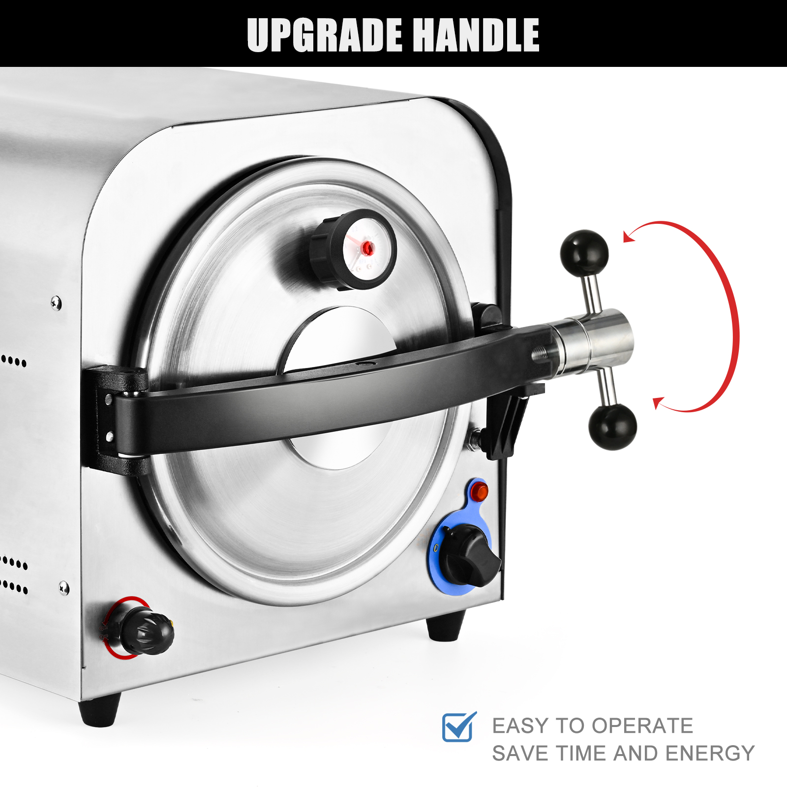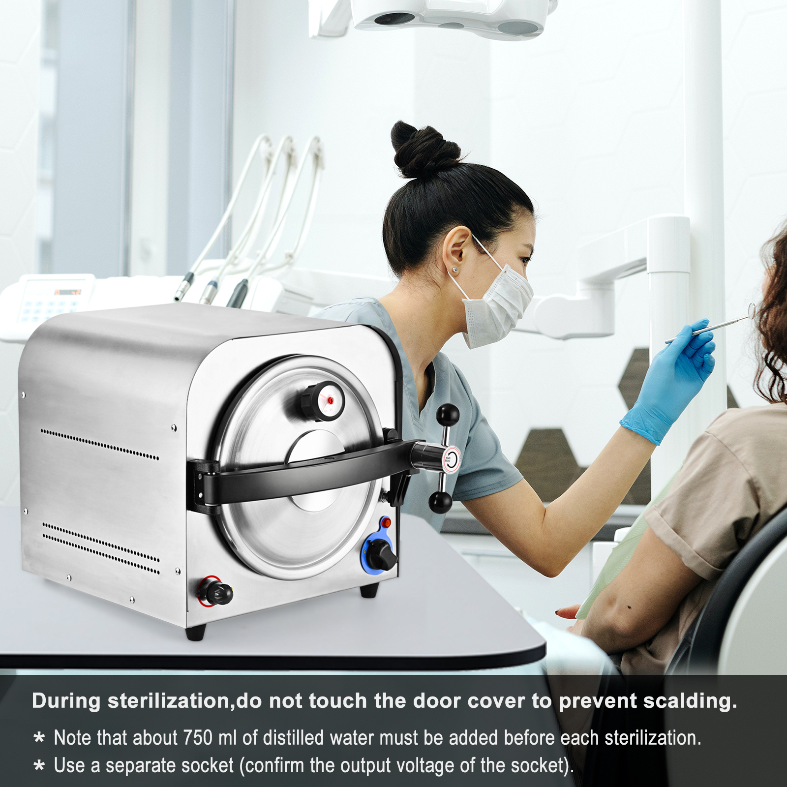 This TR250E Dental 14L Autoclave Steam Sterilizer consists of pressure guage, rotary handle, indicator lamp, timer knob, exhaust drain needle vavle, steam outlet and safety vavle.