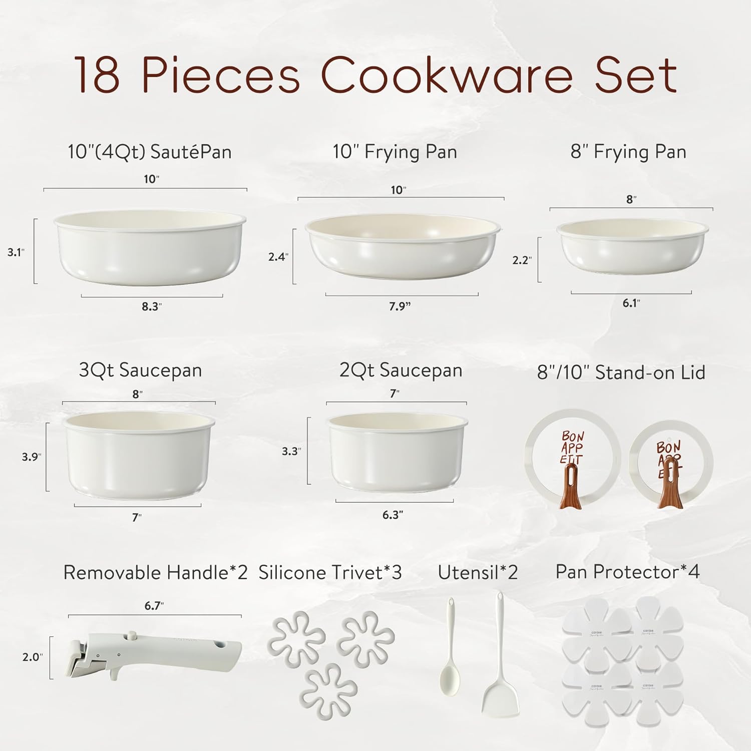 Set Includes8'' frying pan,10'' frying pan,10'' sauté pan,2-qt saucepan,3-qt saucepan,8''/10'' stand-on lid,2*detachable handle,1*silicone spatula,1*soup spoon,4*pot protector and 3*silicone pad.