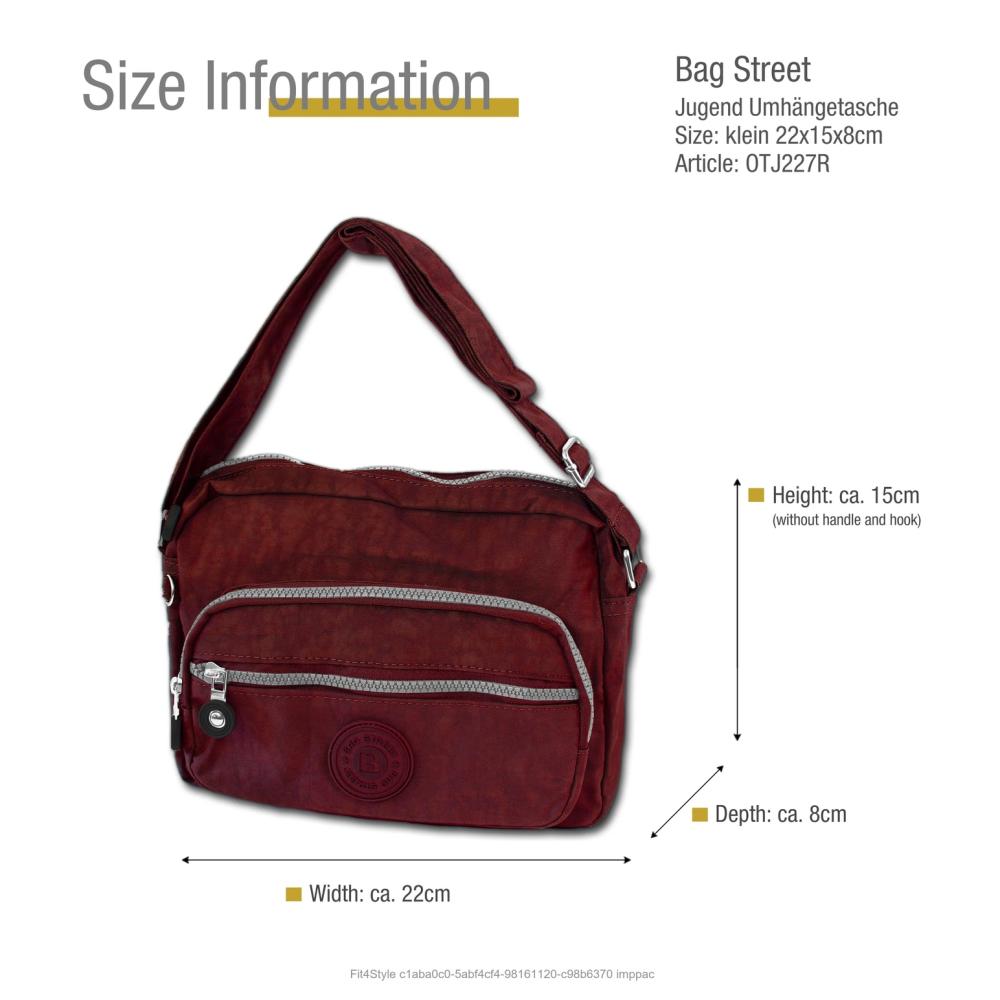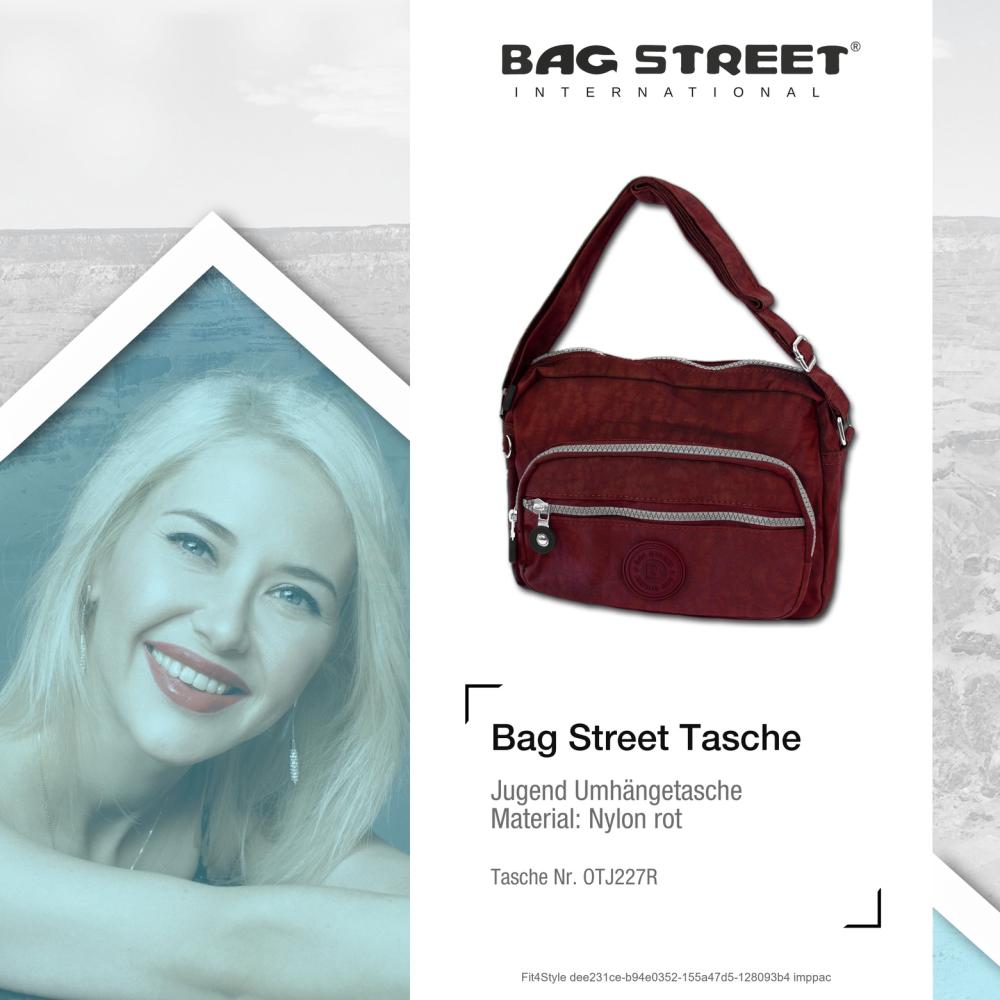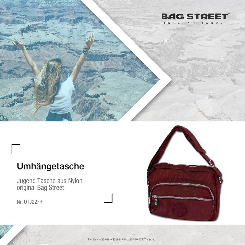 Eine modische Umhängetasche für Damen und Jugendliche der Marke Bag Street in der Farbe rot. Diese sportliche Tasche aus dem robusten Material Nylon mit den Maßen 22cm x 15cm x 8cm hat die Bestellnummer OTJ227R. Durch den stufenlos längenverstellbaren Schultergurt, können sie diese je nach Outfit lang oder kurz tragen.