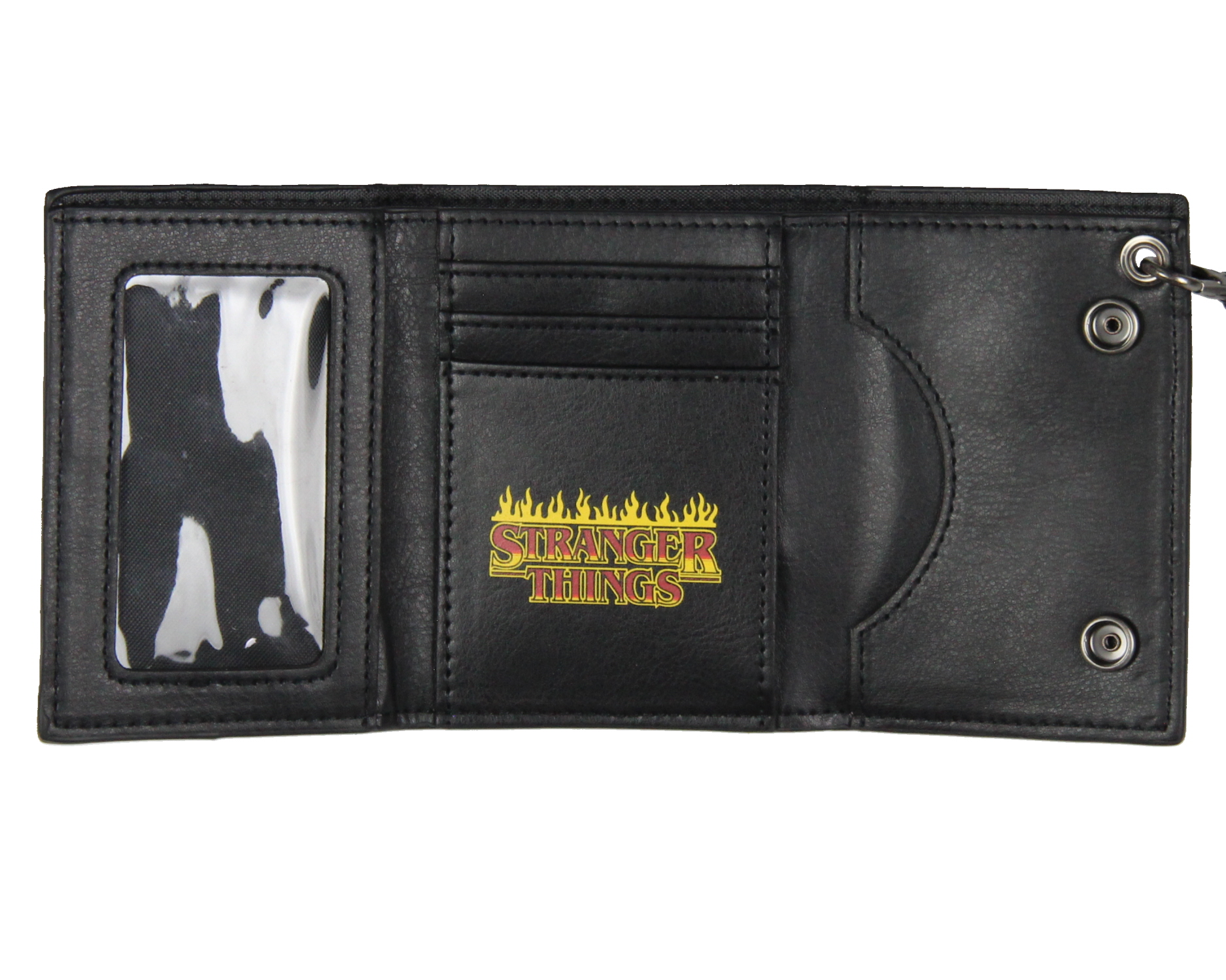 TRI-FOLD SNAP CLOSURE|MEASUREMENTS - This Stranger Things Chain Wallet is a great size for carrying in your back pocket. Approx: 4" L x 4" W x .75" H (When Closed.) The wallet is made of a combination of strong synthetic fabric and faux leather